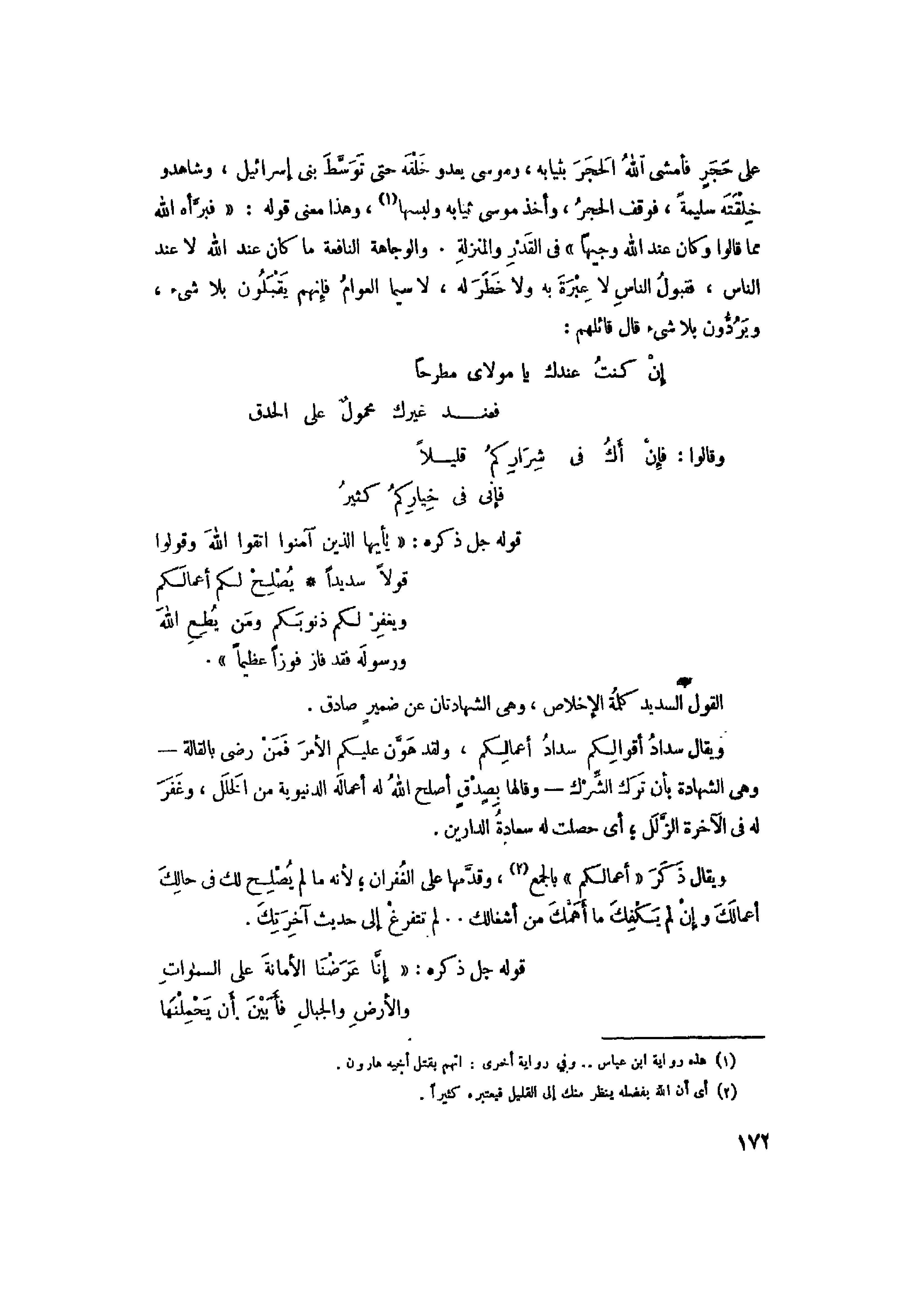 على حجر فأمشى الله الحجر بثيابه، وموسى يعدو خلفه حتى توسّط بنى إسرائيل، وشاهدو خلقته سليمة، فوقف الحجر، وأخذ موسى ثيابه ولبسها «1» ، وهذا معنى قوله: «فَبَرَّأَهُ اللَّهُ مِمَّا قالُوا وَكانَ عِنْدَ اللَّهِ وَجِيهاً» فى القدر والمنزلة. والوجاهة النافعة ما كان عند الله لا عند الناس، فقبول الناس لا عبرة به ولا خطر له، ولا سيما العوام فإنهم يقبلون بلا شىء، ويردّون بلا شىء قال قائلهم: