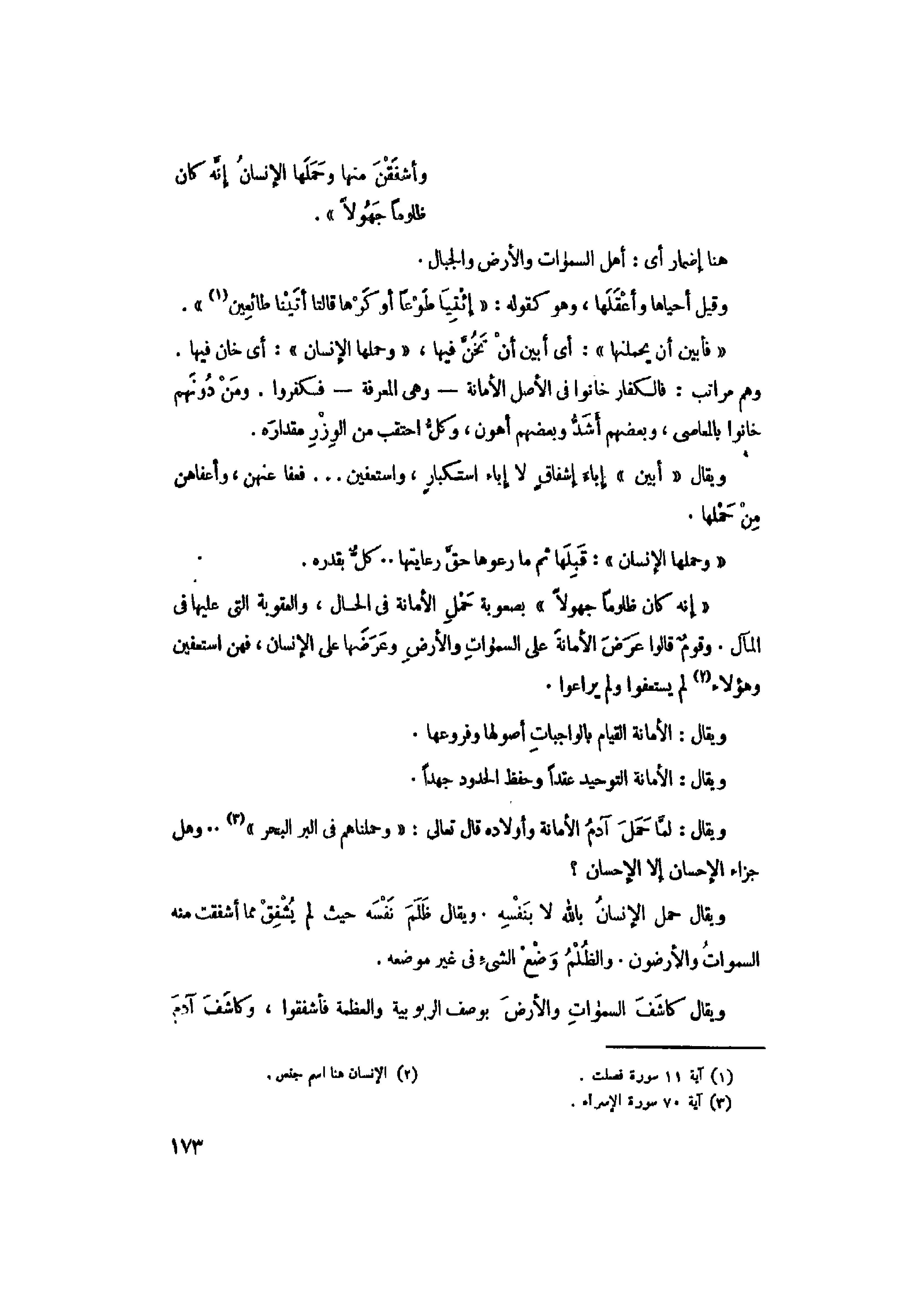 «إِنَّهُ كانَ ظَلُوماً جَهُولًا» بصعوبة حمل الأمانة في الحال، والعقوبة التي عليها في المآل. وقوم قالوا عرض الأمانة على السماوات والأرض وعرضها على الإنسان، فهن استعفين وهؤلاء «2» لم يستعفوا ولم يراعوا.