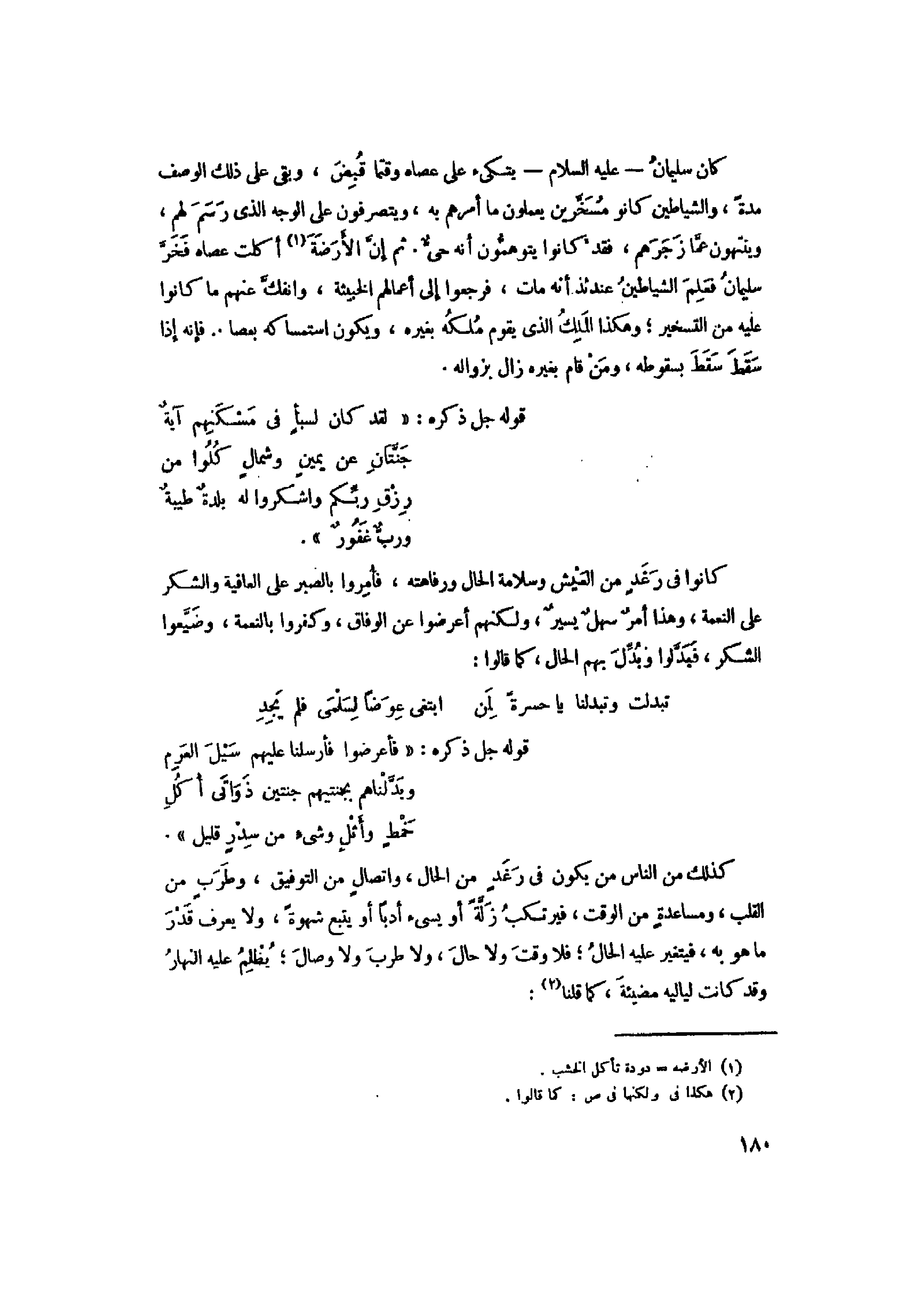 كان سليمان- عليه السلام- يتكىء على عصاه وقتما قبض، وبقي على ذلك الوصف مدة، والشياطين كانوا مسخّرين يعملون ما أمرهم به، ويتصرفون على الوجه الذي رسم لهم، وينتهون عمّا زجرهم، فقد كانوا يتوهمّون أنه حيّ. ثم إنّ الأرضة «1» أكلت عصاه فخرّ سليمان فعلم الشياطين عندئذ أنه مات، فرجعوا إلى أعمالهم الخبيثة، وانفكّ عنهم ما كانوا عليه من التسخير وهكذا الملك الذي يقوم ملكه بغيره، ويكون استمساكه بعصا.. فإنه إذا سقط سقط بسقوطه، ومن قام بغيره زال بزواله.