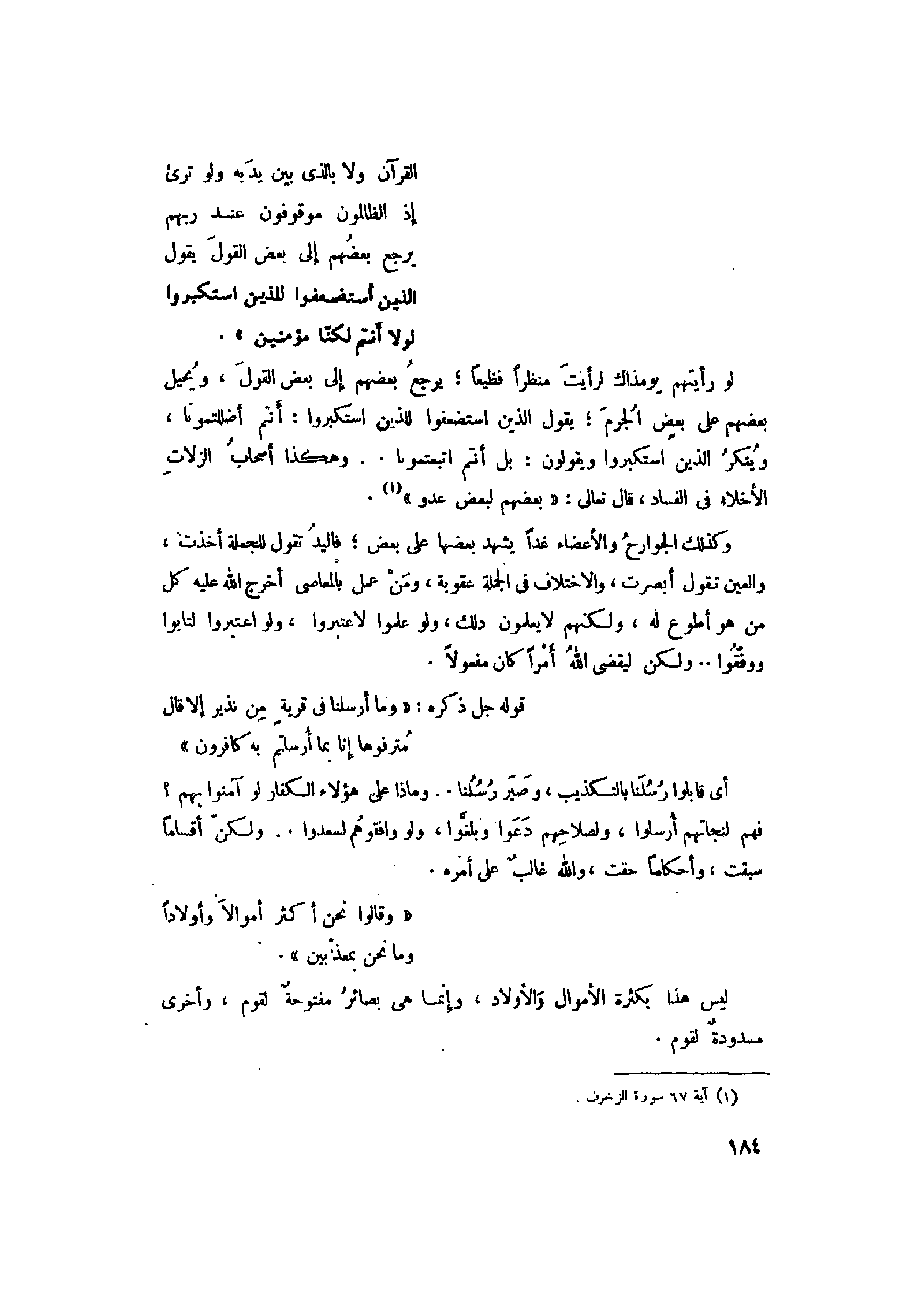 وَما أَرْسَلْنا فِي قَرْيَةٍ مِنْ نَذِيرٍ إِلاَّ قالَ مُتْرَفُوها إِنَّا بِما أُرْسِلْتُمْ بِهِ كافِرُونَ (34) وَقالُوا نَحْنُ أَكْثَرُ أَمْوالاً وَأَوْلاداً وَما نَحْنُ بِمُعَذَّبِينَ (35)