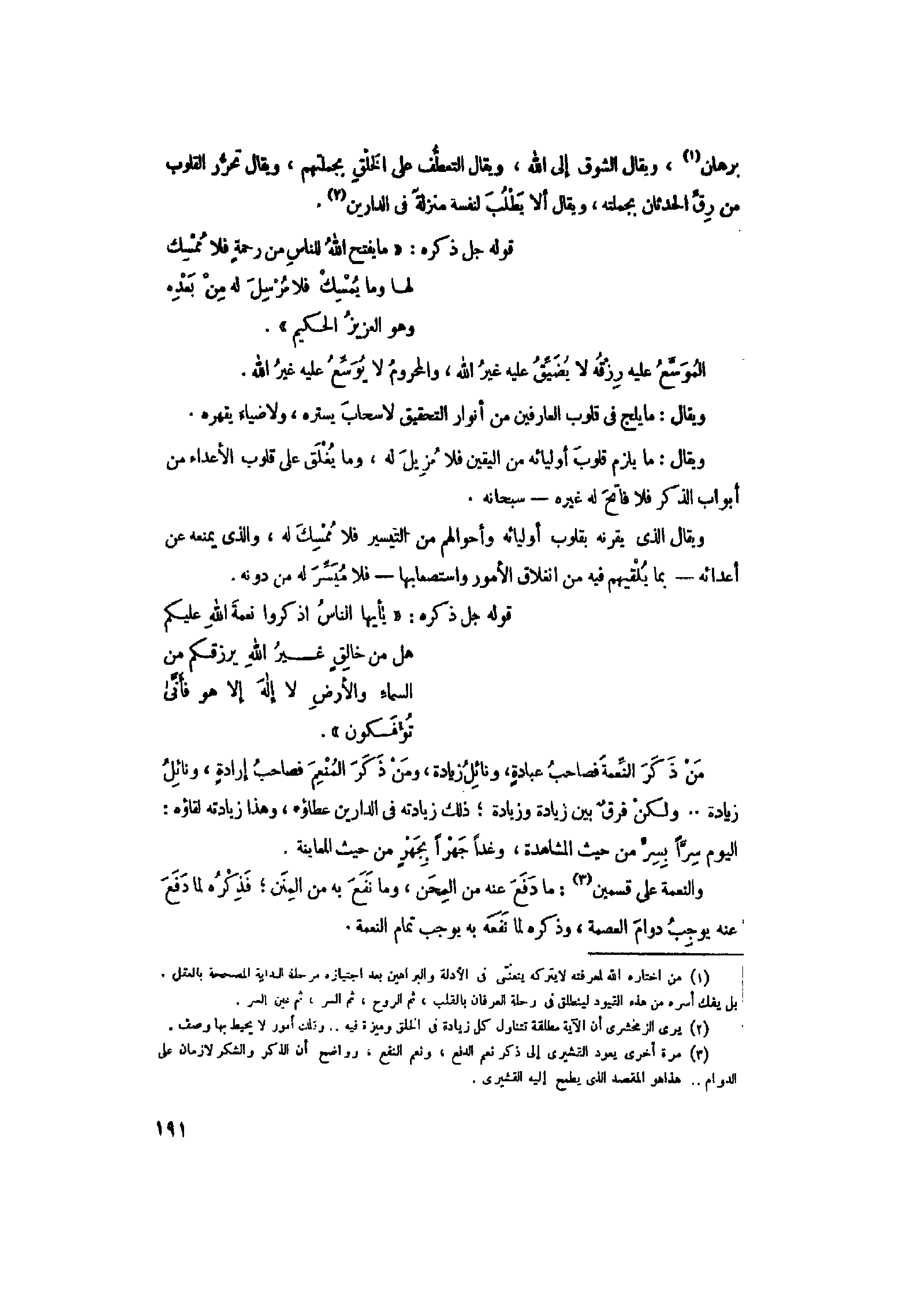 (3) مرة أخرى يعود القشيري إلى ذكر نعم الدفع، ونعم النفع، وواضح أن الذكر والشكر لا زمان على الدوام.. هذا هو المقصد الذي يطمح إليه القشيري.