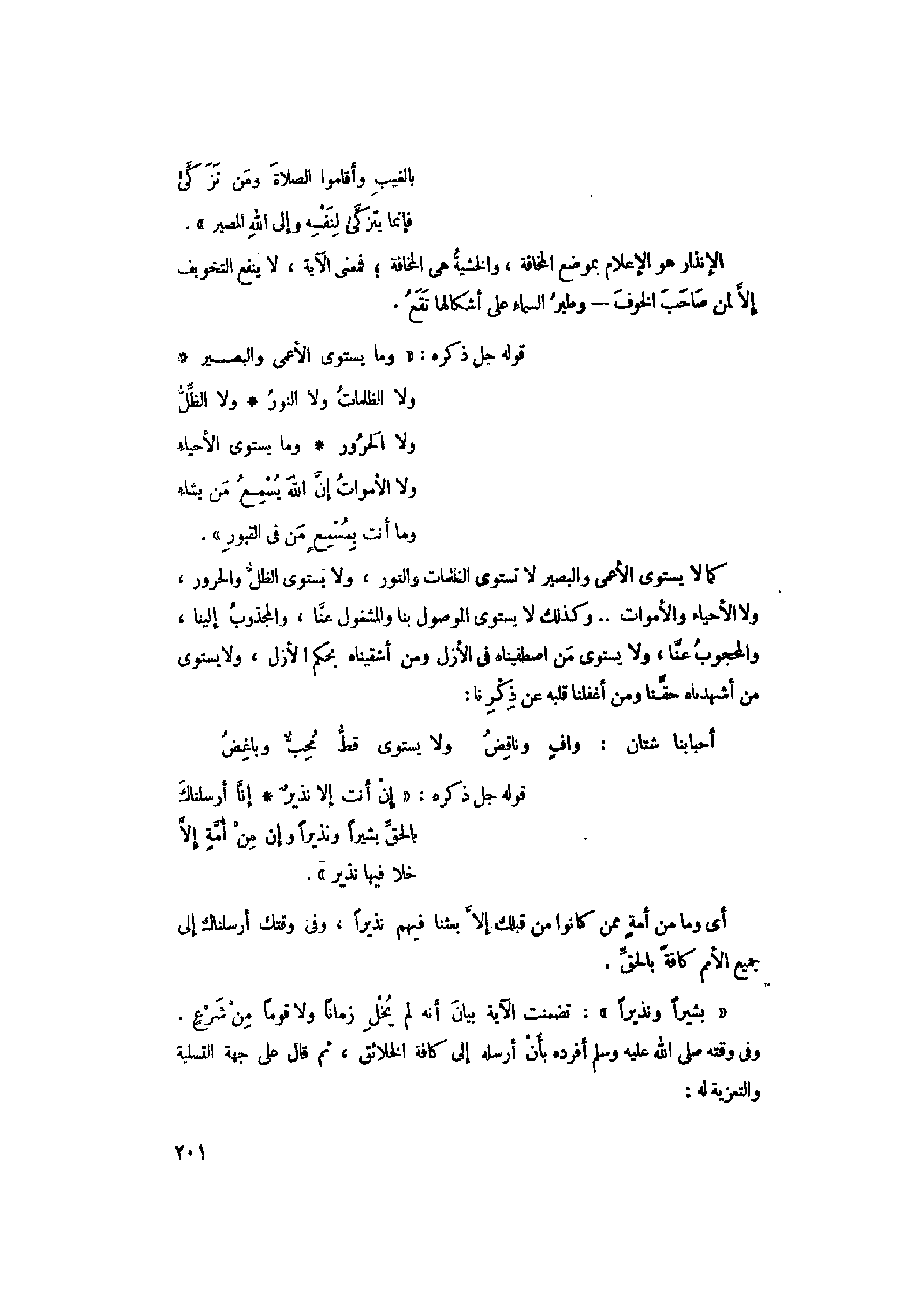 وَما يَسْتَوِي الْأَعْمى وَالْبَصِيرُ (19) وَلا الظُّلُماتُ وَلا النُّورُ (20) وَلا الظِّلُّ وَلا الْحَرُورُ (21) وَما يَسْتَوِي الْأَحْياءُ وَلا الْأَمْواتُ إِنَّ اللَّهَ يُسْمِعُ مَنْ يَشاءُ وَما أَنْتَ بِمُسْمِعٍ مَنْ فِي الْقُبُورِ (22)