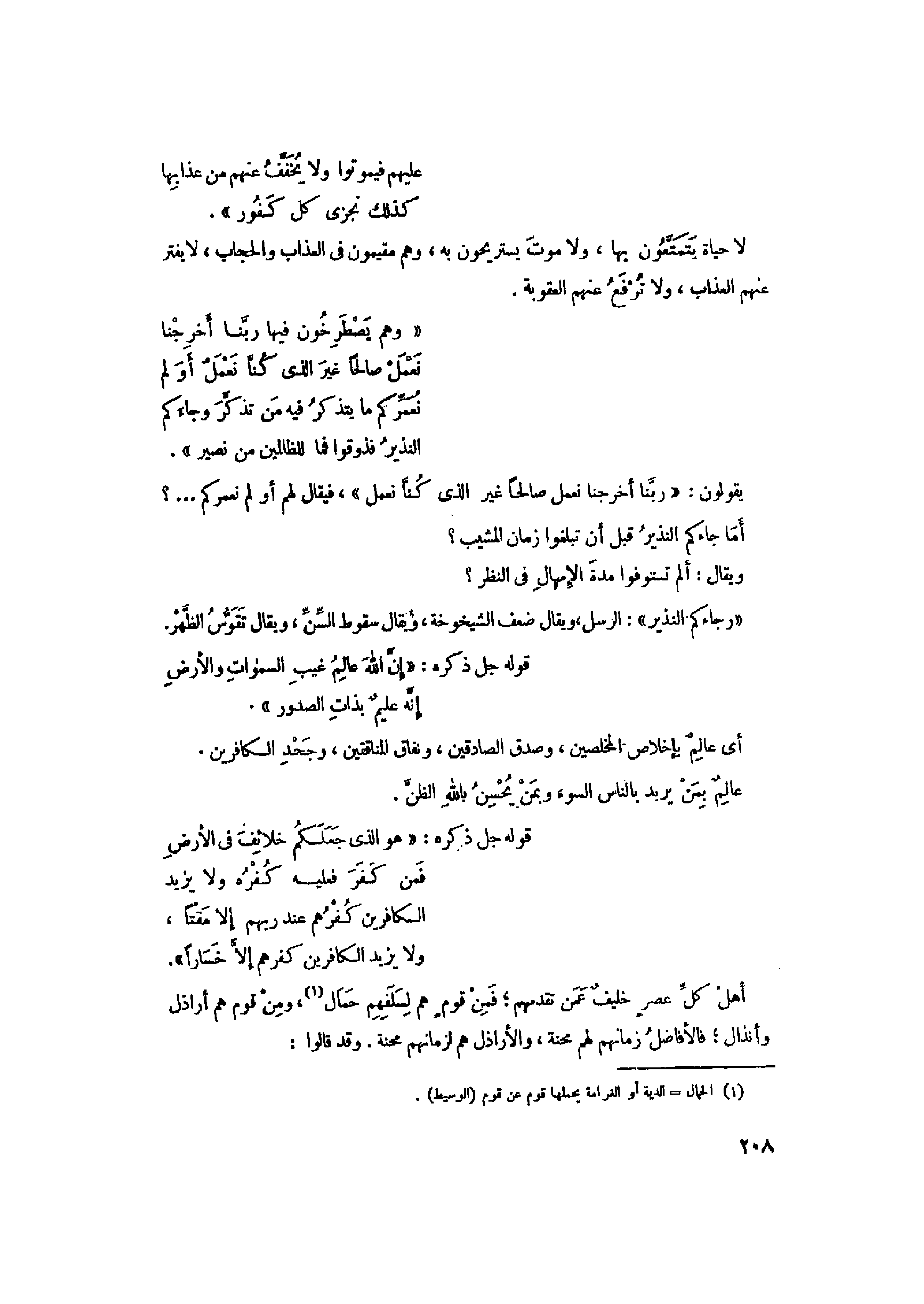 «وَهُمْ يَصْطَرِخُونَ فِيها رَبَّنا أَخْرِجْنا نَعْمَلْ صالِحاً غَيْرَ الَّذِي كُنَّا نَعْمَلُ أَوَلَمْ نُعَمِّرْكُمْ ما يَتَذَكَّرُ فِيهِ مَنْ تَذَكَّرَ وَجاءَكُمُ النَّذِيرُ فَذُوقُوا فَما لِلظَّالِمِينَ مِنْ نَصِيرٍ» يقولون: «رَبَّنا أَخْرِجْنا نَعْمَلْ صالِحاً غَيْرَ الَّذِي كُنَّا نَعْمَلُ» ، فيقال لهم أو لم نعمركم ... ؟