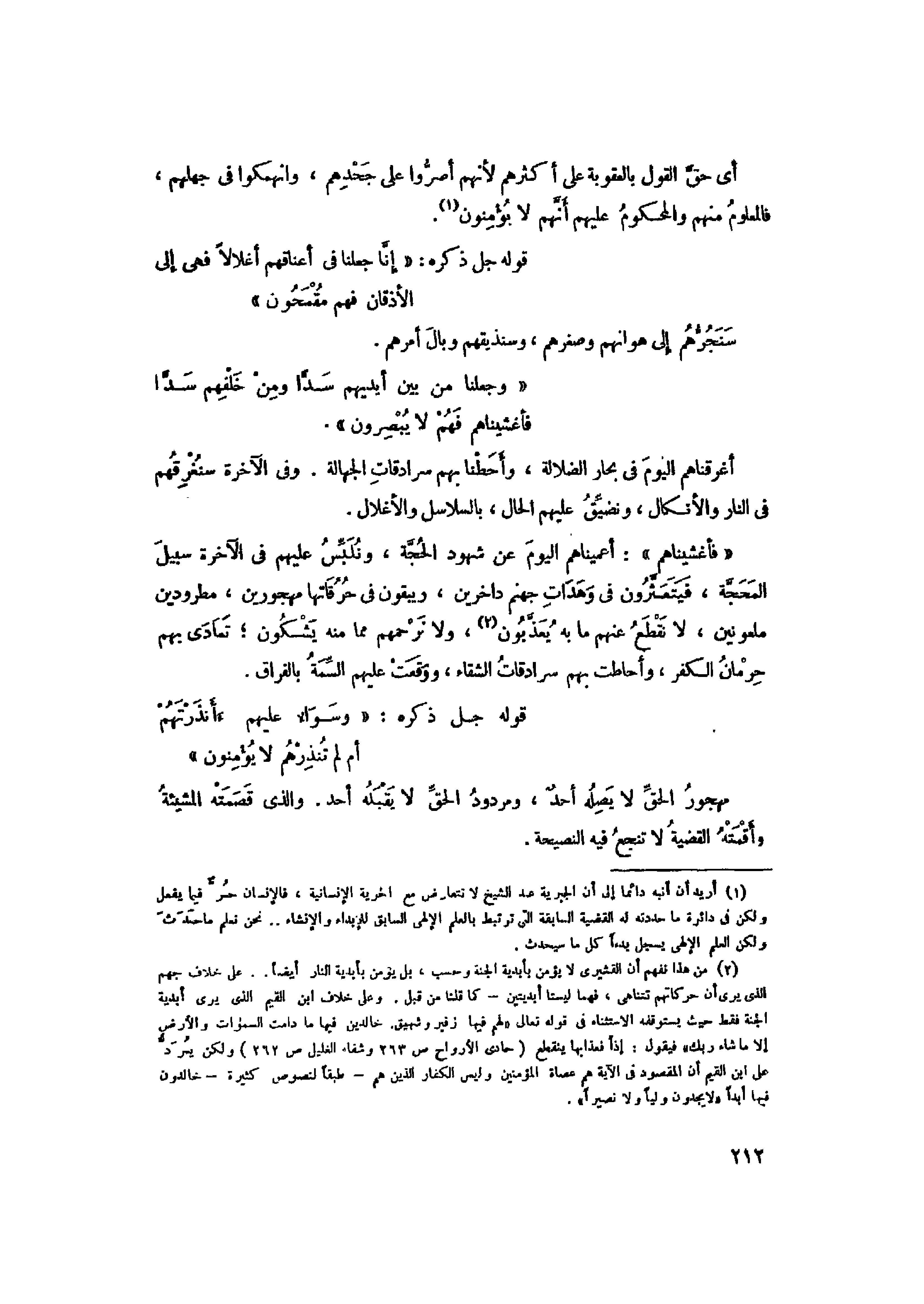 (1) أريد أن أنبه دائما إلى أن الجبرية عند الشيخ لا تتعارض مع الحرية الإنسانية، فالإنسان حسرّ فيما يفعل ولكن في دائرة ما حددته له القضية السابقة التي ترتبط بالعلم الإلهى السابق للإبداء والإنشاء.. نحن نعلم ما حسدث ولكن العلم الإلهى يسجل بدءا كل ما سيحدث.