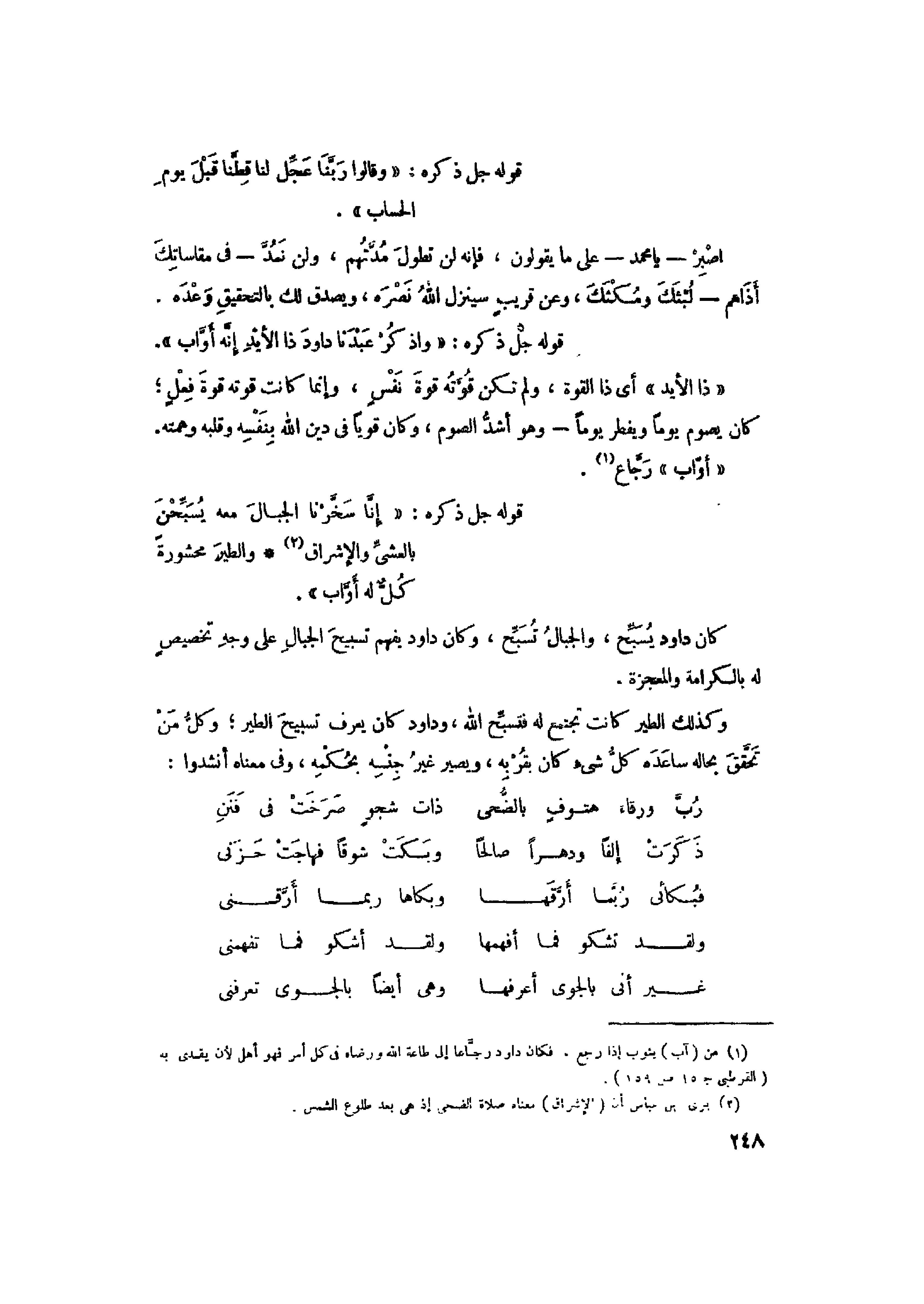 (1) من (آب) يثوب إذا رجع، فكان داود رجّاعا إلى طاعة الله ورضاه في كل أمر فهو أهل لأن يقتدى به (القرطبي ج 15 ص 159) .