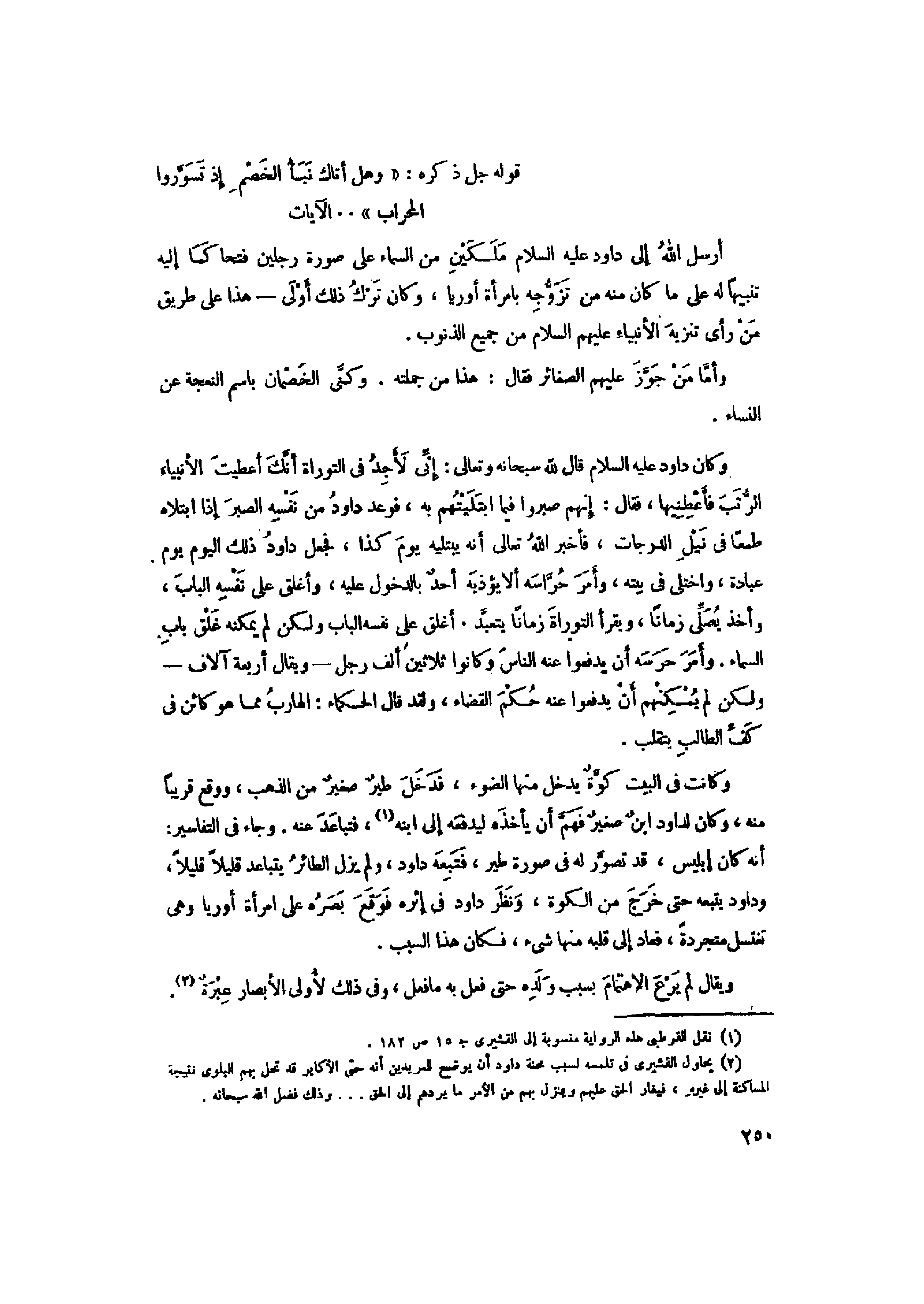 (2) يحاول القشيري في تلمسه لسبب محنة داود أن يوضح المريدين أنه حتى الأكابر قد تحل بهم البلوى نتيجة المساكنة إلى غيره، فيغار الحق عليهم وينزل بهم من الأمر ما يردهم إلى الحق ... وذلك فضل الله سبحانه.