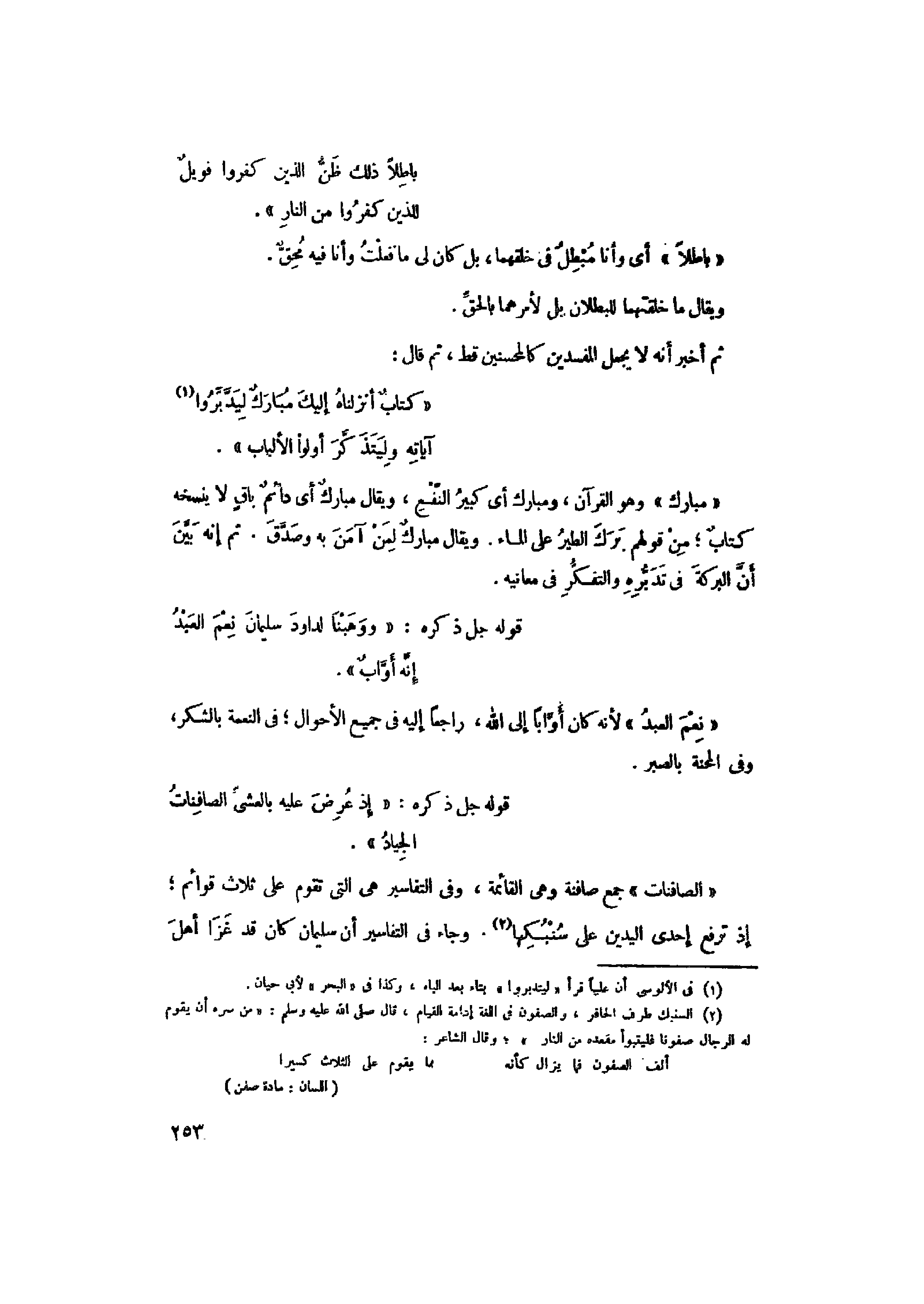 (2) السنبك طرف الحافر، والصفون في اللغة إدامة القيام، قال صلى الله عليه وسلم: «من سره أن يقوم له الرجال صفونا فليتبوا مقعده من النار» وقال الشاعر: