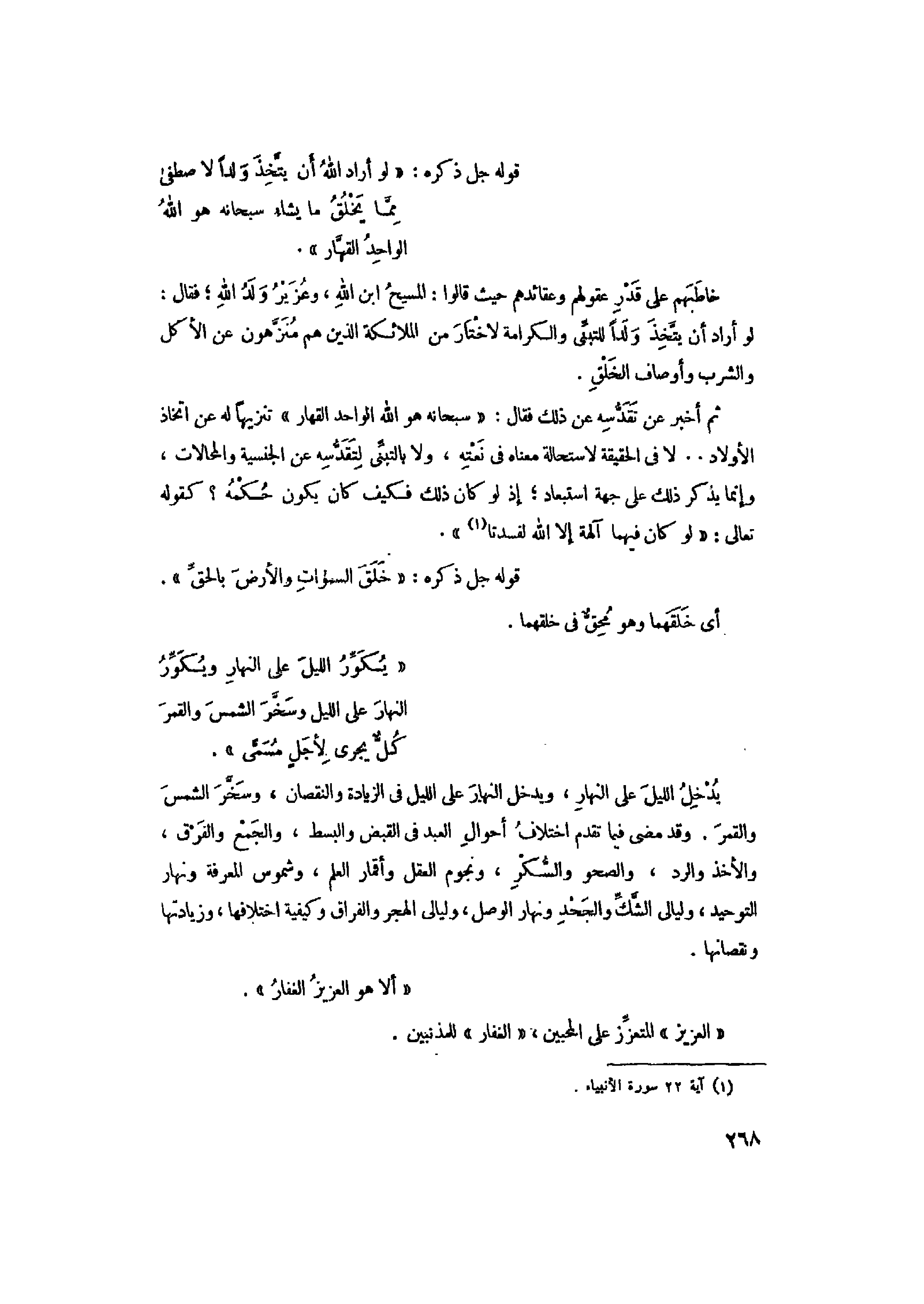 ثم أخبر عن تقدّسه عن ذلك فقال: «سُبْحانَهُ هُوَ اللَّهُ الْواحِدُ الْقَهَّارُ» تنزيها له عن اتخاذ الأولاد.. لا في الحقيقة لاستحالة معناه في نعته، ولا بالتبنى لتقدّسه عن الجنسية والمحالات، وإنما يذكر ذلك على جهة استبعاد إذ لو كان ذلك فكيف كان يكون حكمه؟ كقوله تعالى: «لَوْ كانَ فِيهِما آلِهَةٌ إِلَّا اللَّهُ لَفَسَدَتا «1» » .