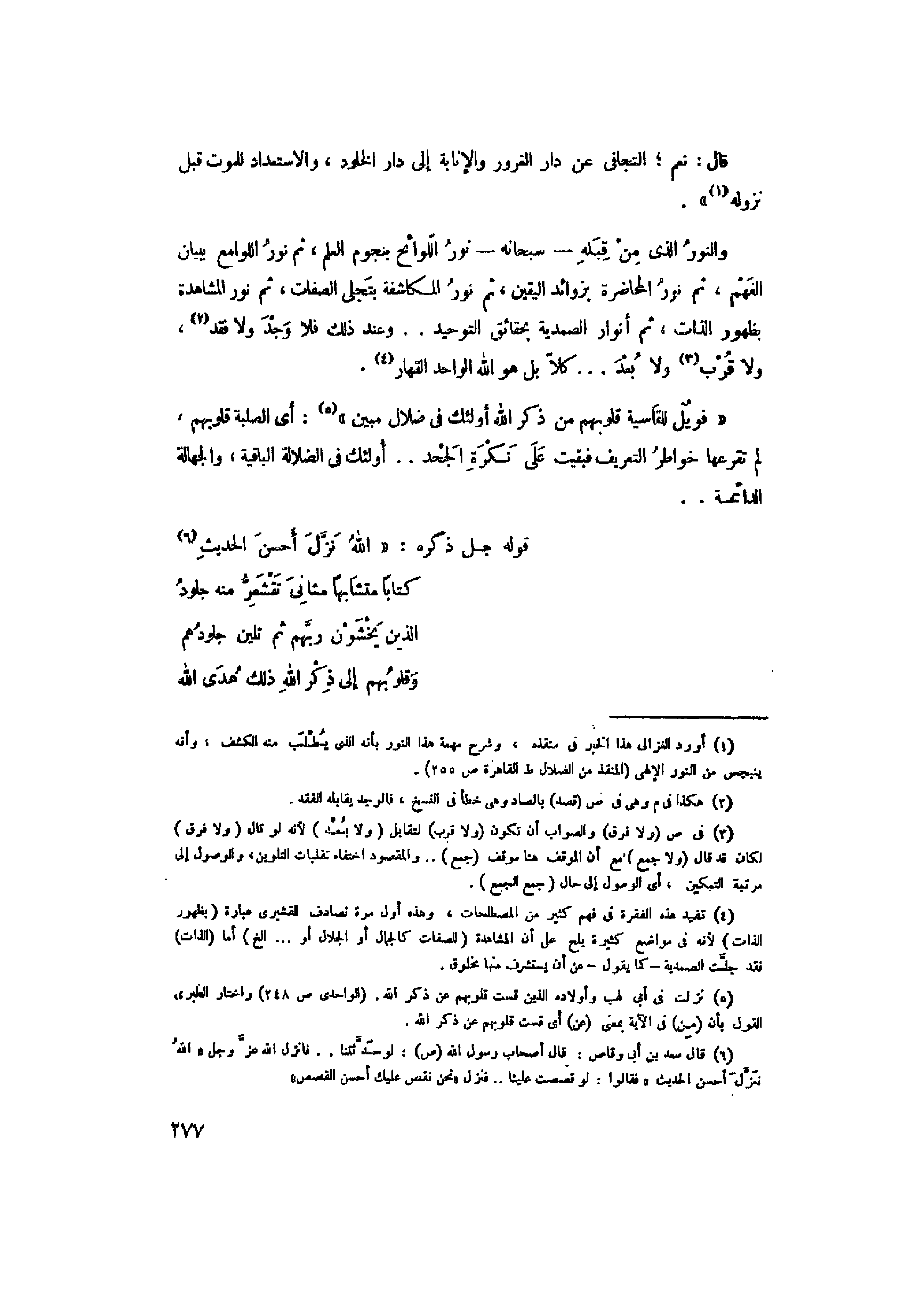 والنور الذي من قبله- سبحانه- نور الّلوائح بنجوم العلم، ثم نور اللوامع ببيان الفهم، ثم نور المحاضرة بزوائد اليقين، ثم نور المكاشفة بتجلى الصفات، ثم نور المشاهدة بظهور الذات، ثم أنوار الصمدية بحقائق التوحيد.. وعند ذلك فلا وجد ولا فقد «2» ، ولا قرب «3» ولا بعد ... كلّا بل هو الله الواحد القهار «4» .