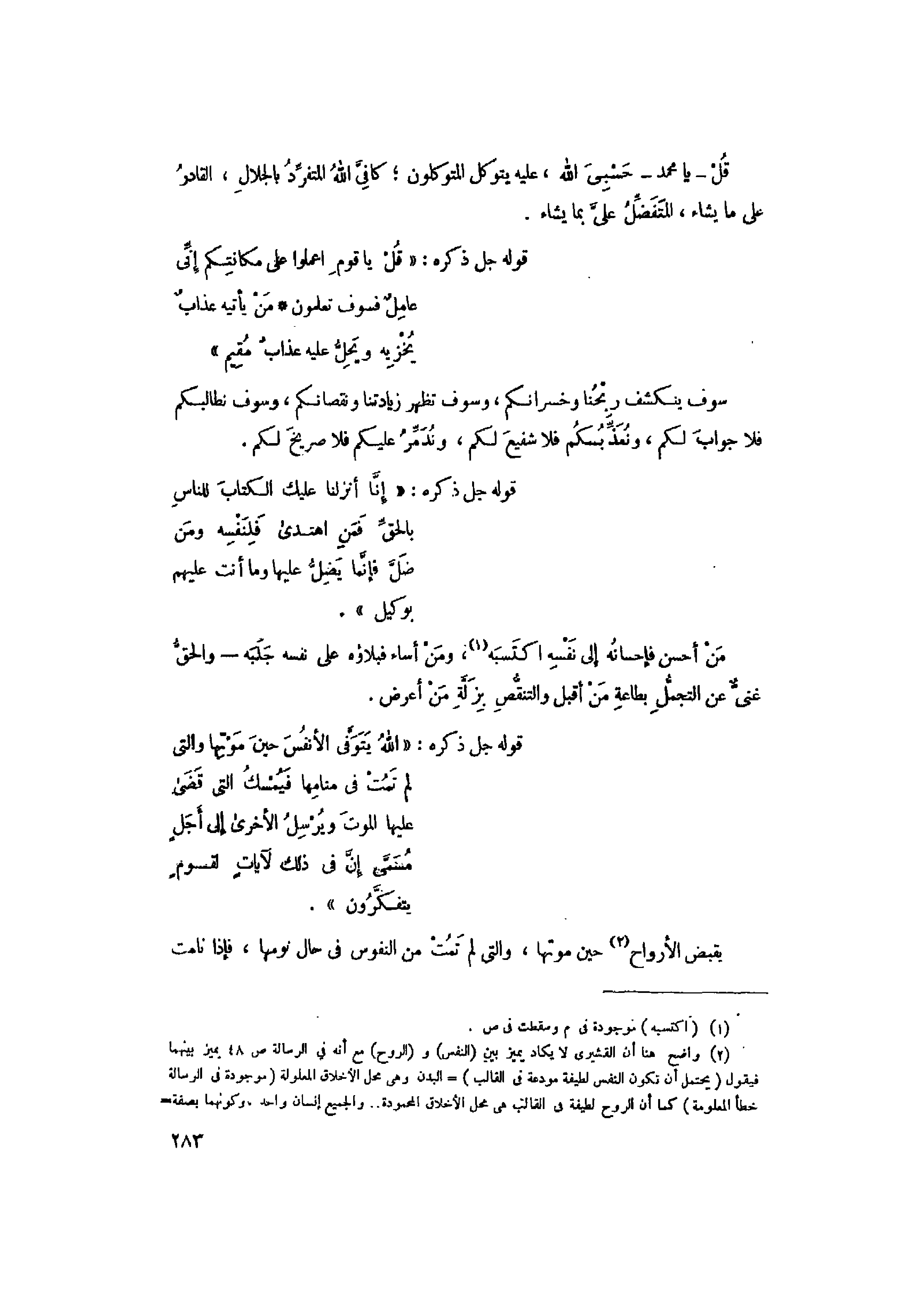 (2) واضح هنا أن القشيري لا يكاد يميز بين (النفس) و (الروح) مع أنه في الرسالة ص 48 يميز بينهما فيقول (يحتمل أن تكون النفس لطيفة مودعة في القالب) - البدن وهي محل الأخلاق المعلولة (موجودة في الرسالة خطأ المعلومة) كما أن الروح لطيفة في القالب هي محل الأخلاق المحمودة.. والجميع إنسان واحد، وكونهما بصفة-