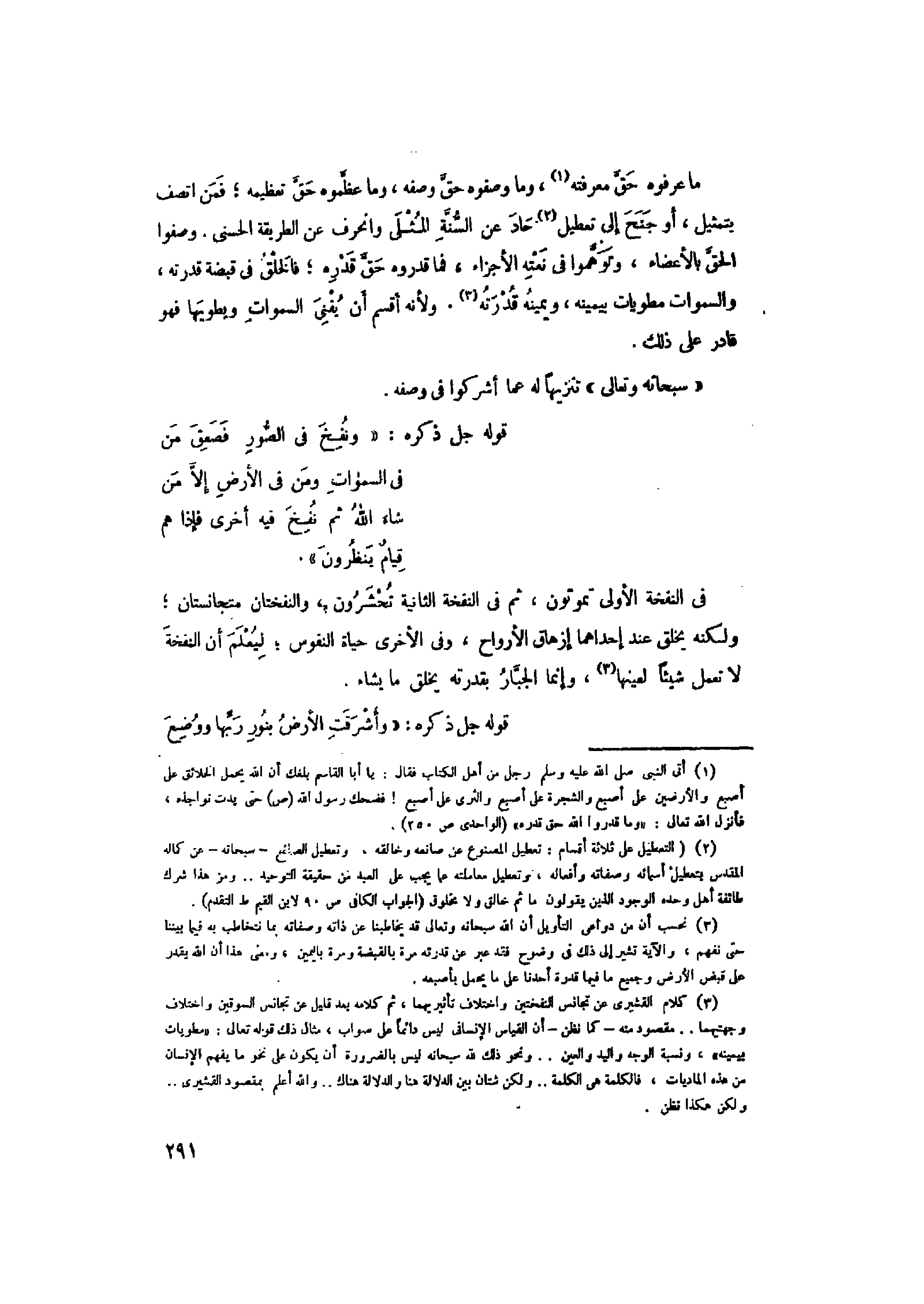 (4) كلام القشيري عن تجانس النفختين واختلاف تأثيريهما، ثم كلامه بعد قليل عن تجانس السوقين واختلاف وجهتيهما.. مقصود منه- كما نظن- أن القياس الإنسانى ليس دائما على صواب، مثال ذلك قوله تعالى: «مطويات بيمينه» ، ونسبة الوجه واليد والعين.. ونحو ذلك لله سبحانه ليس بالضرورة أن يكون على نحو ما يفهم الإنسان من هذه الماديات، فالكلمة هي الكلمة.. ولكن شتان بين الدلالة هنا والدلالة هناك.. والله أعلم بمقصود القشيري..