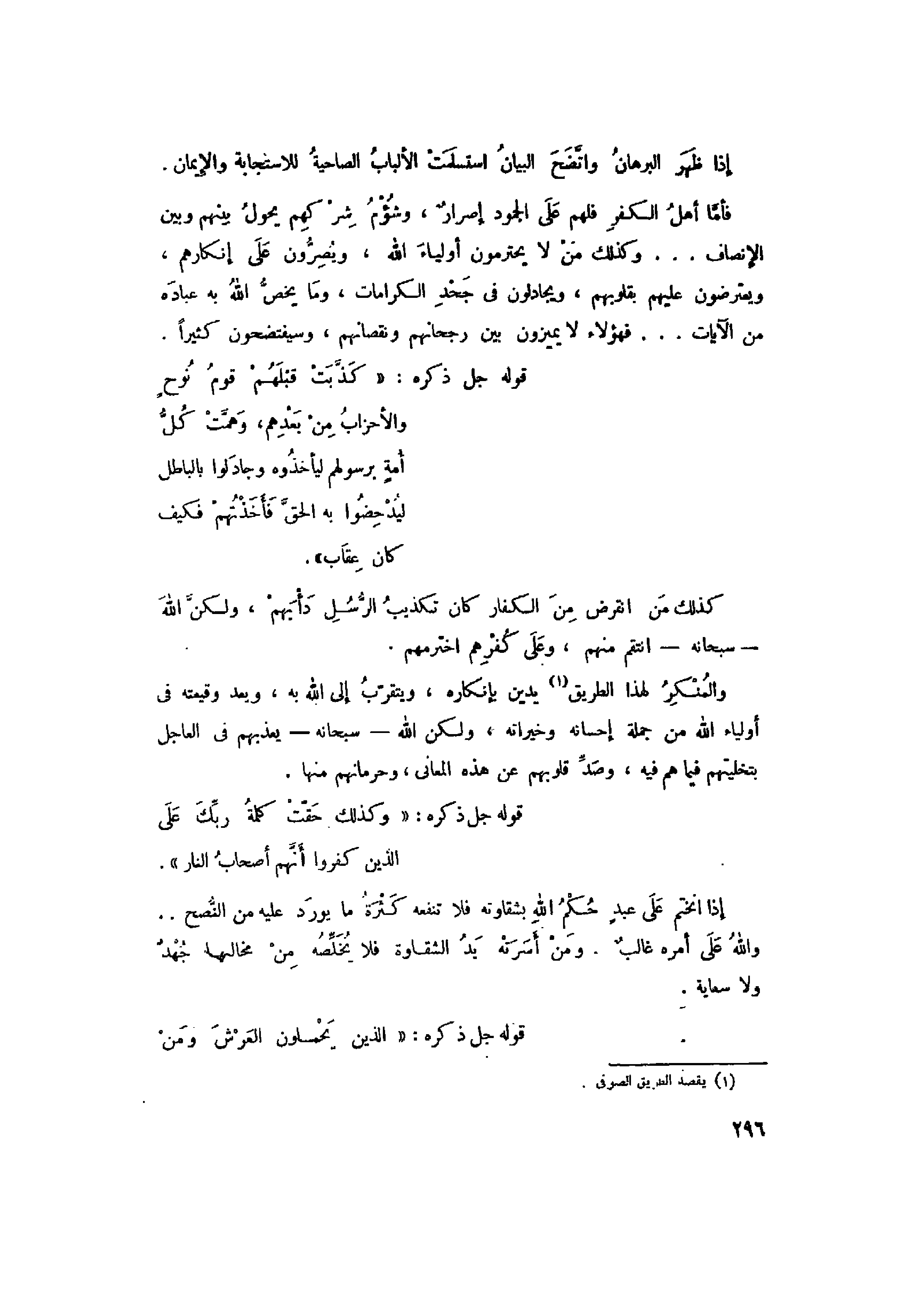 والمنكر لهذا الطريق «1» يدين بإنكاره، ويتقرّب إلى الله به، ويعد وقيعته في أولياء الله من جملة إحسانه وخيراته، ولكن الله- سبحانه- يعذبهم في العاجل بتخليتهم فيما هم فيه، وصدّ قلوبهم عن هذه المعاني، وحرمانهم منها.