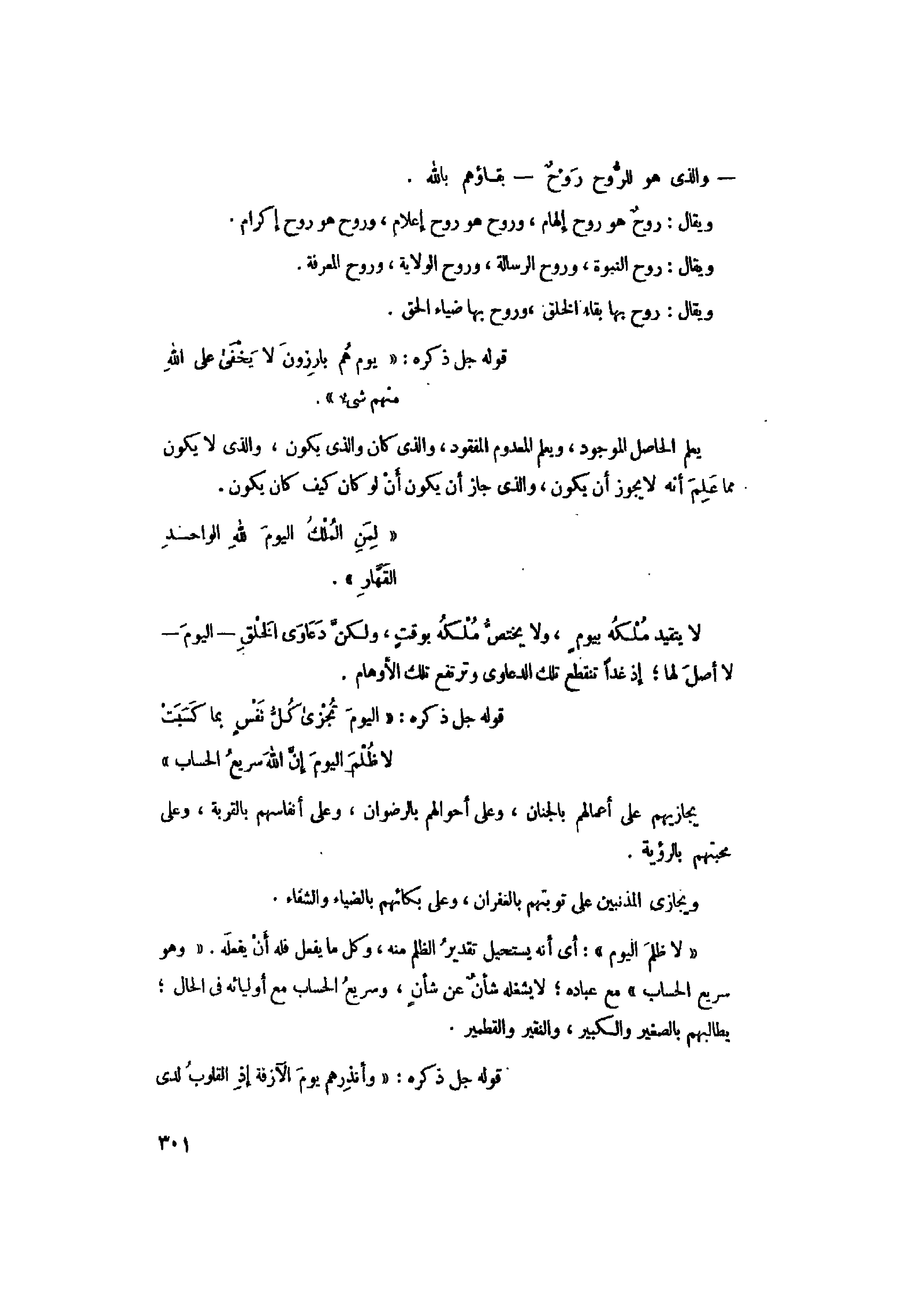 لِمَنِ الْمُلْكُ الْيَوْمَ لِلَّهِ الْواحِدِ الْقَهَّارِ لا يتقيد ملكه بيوم، ولا يختصّ ملكه بوقت، ولكنّ دعاوى الخلق- اليوم- لا أصل لها إذ غدا تنقطع تلك الدعاوى وترتفع تلك الأوهام.
