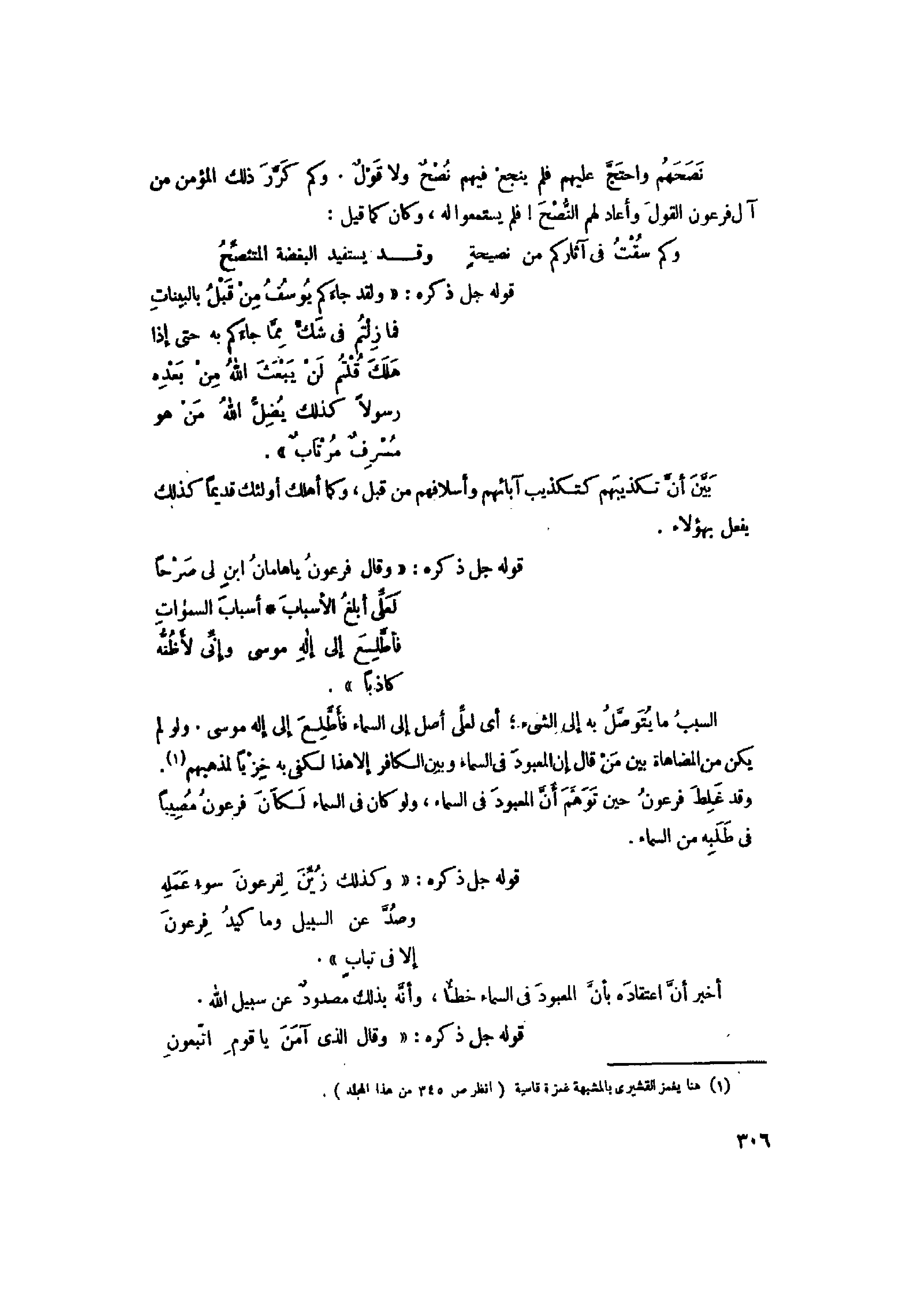 وَقالَ فِرْعَوْنُ يا هامانُ ابْنِ لِي صَرْحاً لَعَلِّي أَبْلُغُ الْأَسْبابَ (36) أَسْبابَ السَّماواتِ فَأَطَّلِعَ إِلى إِلهِ مُوسى وَإِنِّي لَأَظُنُّهُ كاذِباً وَكَذلِكَ زُيِّنَ لِفِرْعَوْنَ سُوءُ عَمَلِهِ وَصُدَّ عَنِ السَّبِيلِ وَما كَيْدُ فِرْعَوْنَ إِلاَّ فِي تَبابٍ (37)