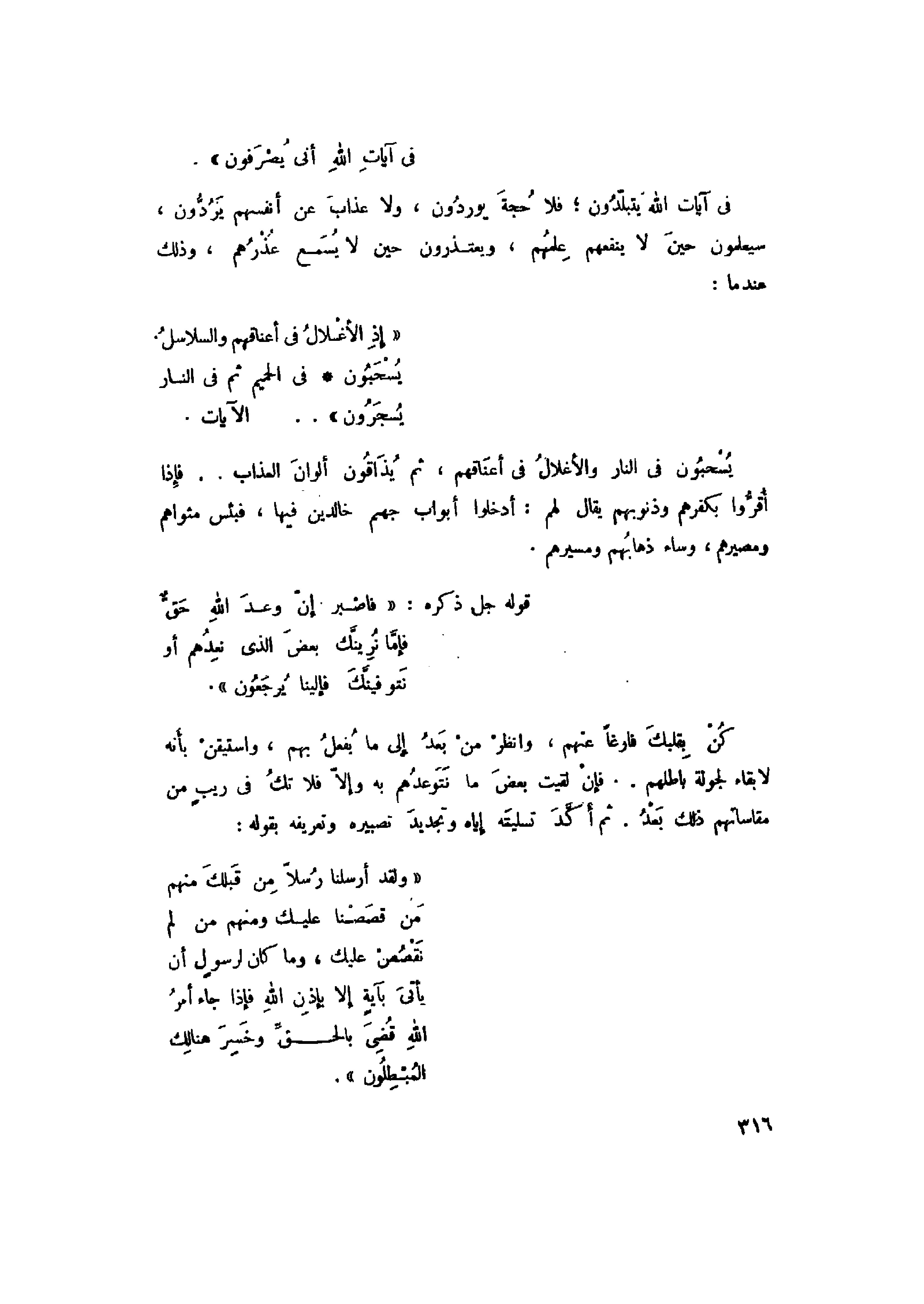 إِذِ الْأَغْلالُ فِي أَعْناقِهِمْ وَالسَّلاسِلُ يُسْحَبُونَ (71) فِي الْحَمِيمِ ثُمَّ فِي النَّارِ يُسْجَرُونَ (72) ثُمَّ قِيلَ لَهُمْ أَيْنَ ما كُنْتُمْ تُشْرِكُونَ (73) مِنْ دُونِ اللَّهِ قالُوا ضَلُّوا عَنَّا بَلْ لَمْ نَكُنْ نَدْعُوا مِنْ قَبْلُ شَيْئاً كَذلِكَ يُضِلُّ اللَّهُ الْكافِرِينَ (74) ذلِكُمْ بِما كُنْتُمْ تَفْرَحُونَ فِي الْأَرْضِ بِغَيْرِ الْحَقِّ وَبِما كُنْتُمْ تَمْرَحُونَ (75)