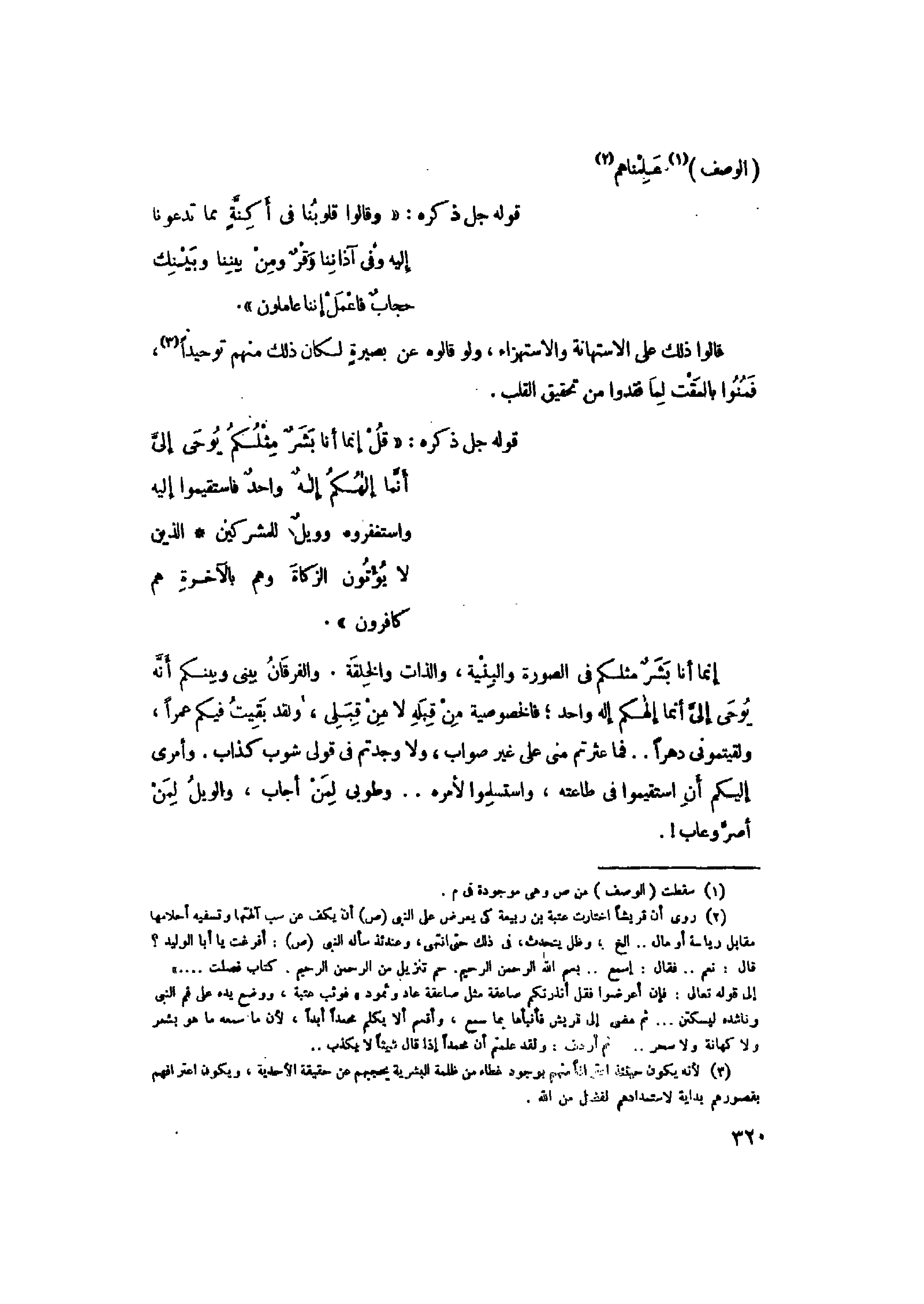 إنما أنا بشر مثلكم في الصورة والبنية، والذات والخلقة. والفرقان بينى وبينكم أنّه يوحى إليّ أنما إلهكم إله واحد فالخصوصية من قبله لا من قبلى، ولقد بقيت فيكم عمرا، ولقيتمونى دهرا.. فما عثرتم منى على غير صواب، ولا وجدتم في قولى شوب كذاب. وأمرى إليكم أن استقيموا في طاعته، واستسلموا لأمره.. وطوبى لمن أجاب، والويل لمن أصرّ وعاب!.