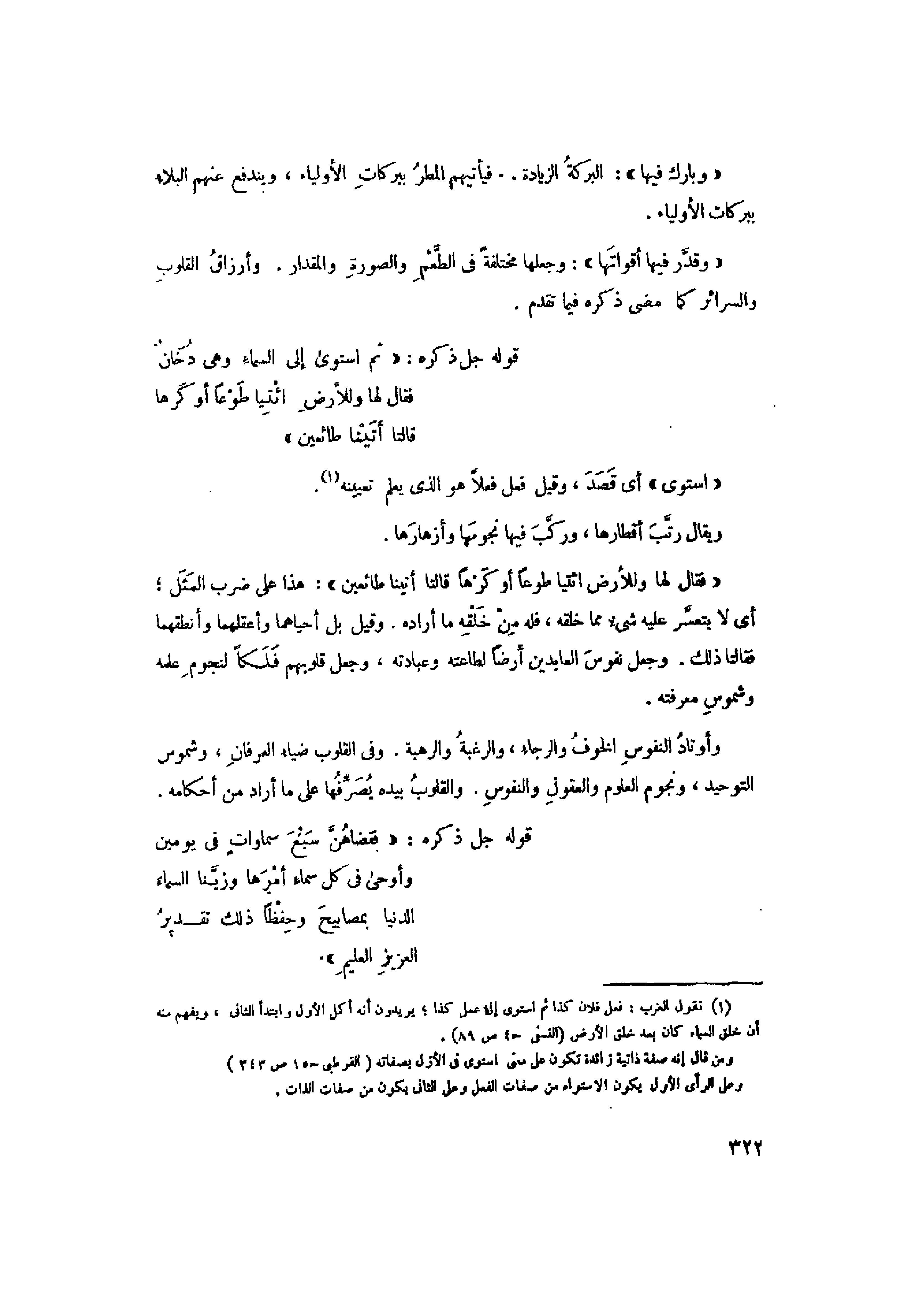 «فَقالَ لَها وَلِلْأَرْضِ ائْتِيا طَوْعاً أَوْ كَرْهاً قالَتا أَتَيْنا طائِعِينَ» : هذا على ضرب المثل أي لا يتعسّر عليه شىء مما خلقه، فله من خلقه ما أراده. وقيل بل أحياهما وأعقلهما وأنطقهما فقالتا ذلك. وجعل نفوس العابدين أرضا لطاعته وعبادته، وجعل قلوبهم فلكا لنجوم علمه وشموس معرفته.