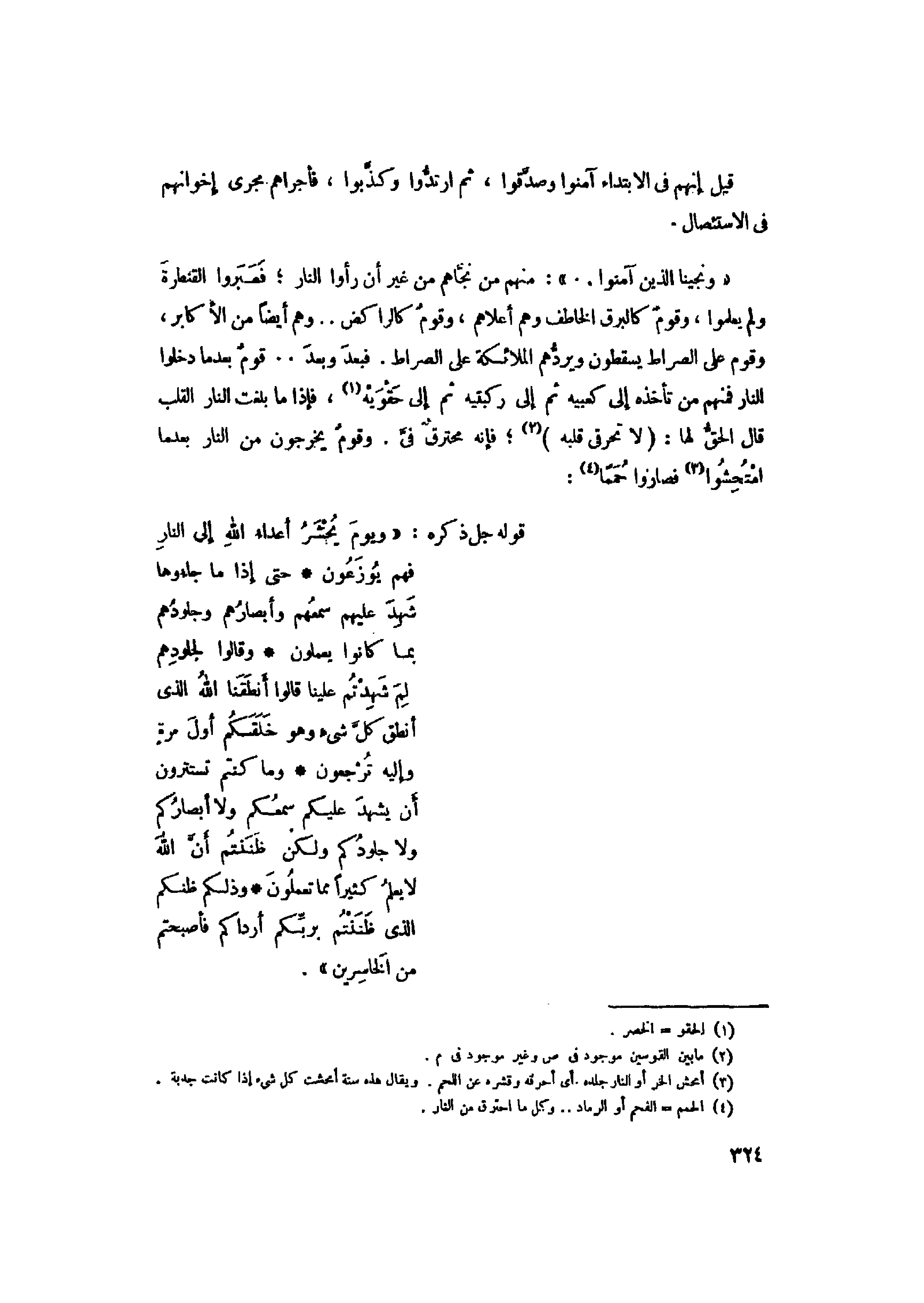 «وَنَجَّيْنَا الَّذِينَ آمَنُوا..» : منهم من نجّاهم من غير أن رأوا النار فعبروا القنطرة ولم يعلموا، وقوم كالبرق الخاطف وهم أعلاهم، وقوم كالراكض.. وهم أيضا من الأكابر، وقوم على الصراط يسقطون ويردّهم الملائكة على الصراط. فبعد وبعد.. قوم بعد ما دخلوا النار فمنهم من تأخذه إلى كعبيه ثم إلى ركبتيه ثم إلى حقويه «1»