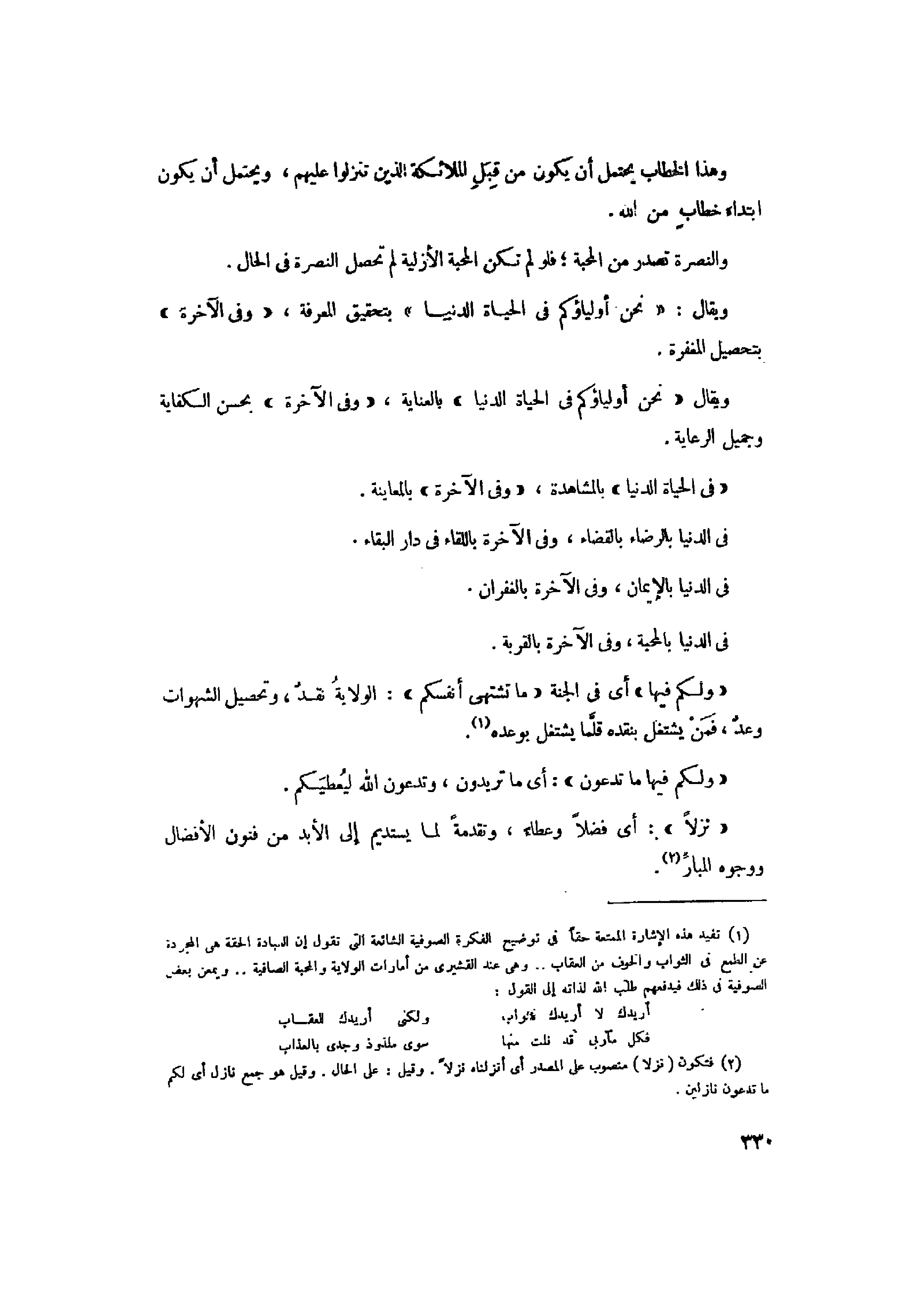 (1) تفيد هذه الإشارة الممتعة حقا في توضيح الفكرة الصوفية الشائعة التي تقول إن العبادة الحقة هي المجردة عن الطمع في الثواب والخوف من العقاب.. وهي عند القشيري من أمارات الولاية والمحبة الصافية.. ويمعن بعض الصوفية في ذلك فيدفعهم طلب الله لذاته إلى القول: