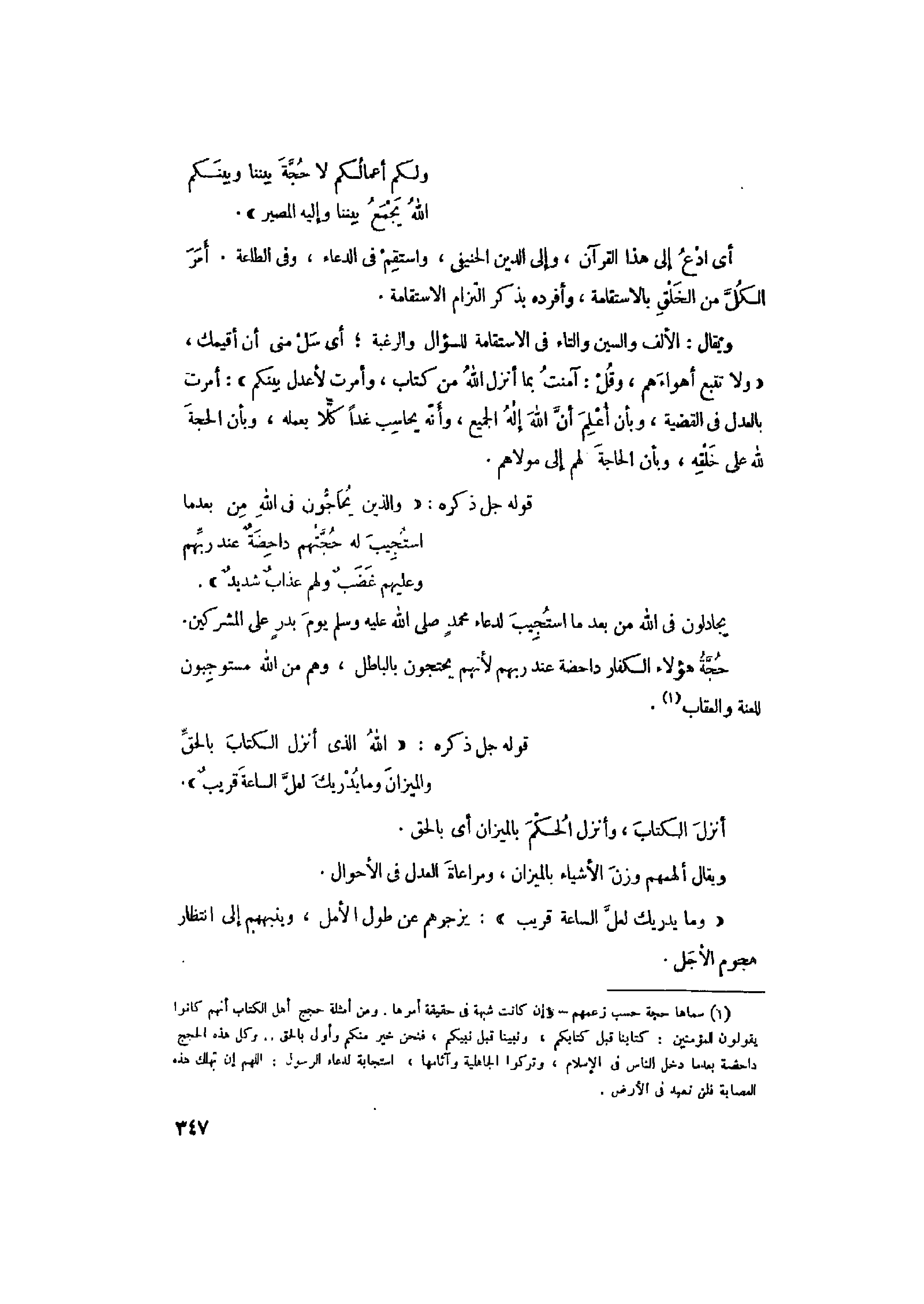 ويقال: الألف والسين والتاء في الاستقامة للسؤال والرغبة أي سل منى أن أقيمك، «وَلا تَتَّبِعْ أَهْواءَهُمْ، وَقُلْ: آمَنْتُ بِما أَنْزَلَ اللَّهُ مِنْ كِتابٍ، وَأُمِرْتُ لِأَعْدِلَ بَيْنَكُمُ» : أمرت بالعدل في القضية، وبأن أعلم أنّ الله إله الجميع، وأنّه يحاسب غدا كلّا بعمله، وبأن الحجة لله على خلقه، وبأن الحاجة لهم إلى مولاهم.