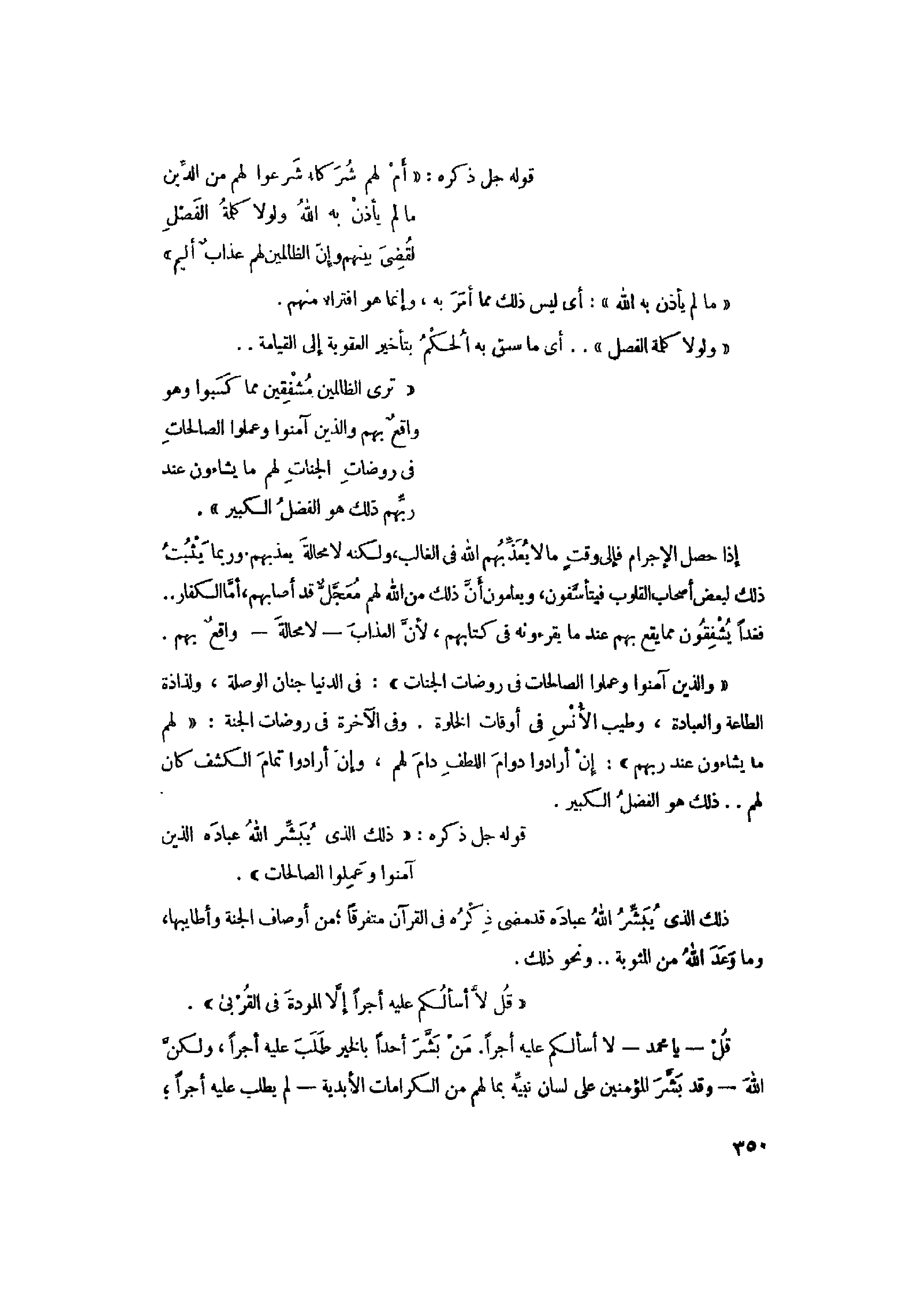 «وَالَّذِينَ آمَنُوا وَعَمِلُوا الصَّالِحاتِ فِي رَوْضاتِ الْجَنَّاتِ» : فى الدنيا جنان الوصلة، ولذاذة الطاعة والعبادة، وطيب الأنس في أوقات الخلوة. وفي الآخرة في روضات الجنة: «لَهُمْ ما يَشاؤُنَ عِنْدَ رَبِّهِمْ» : إن أرادوا دوام اللطف دام لهم، وإن أرادوا تمام الكشف كان لهم.. ذلك هو الفضل الكبير.