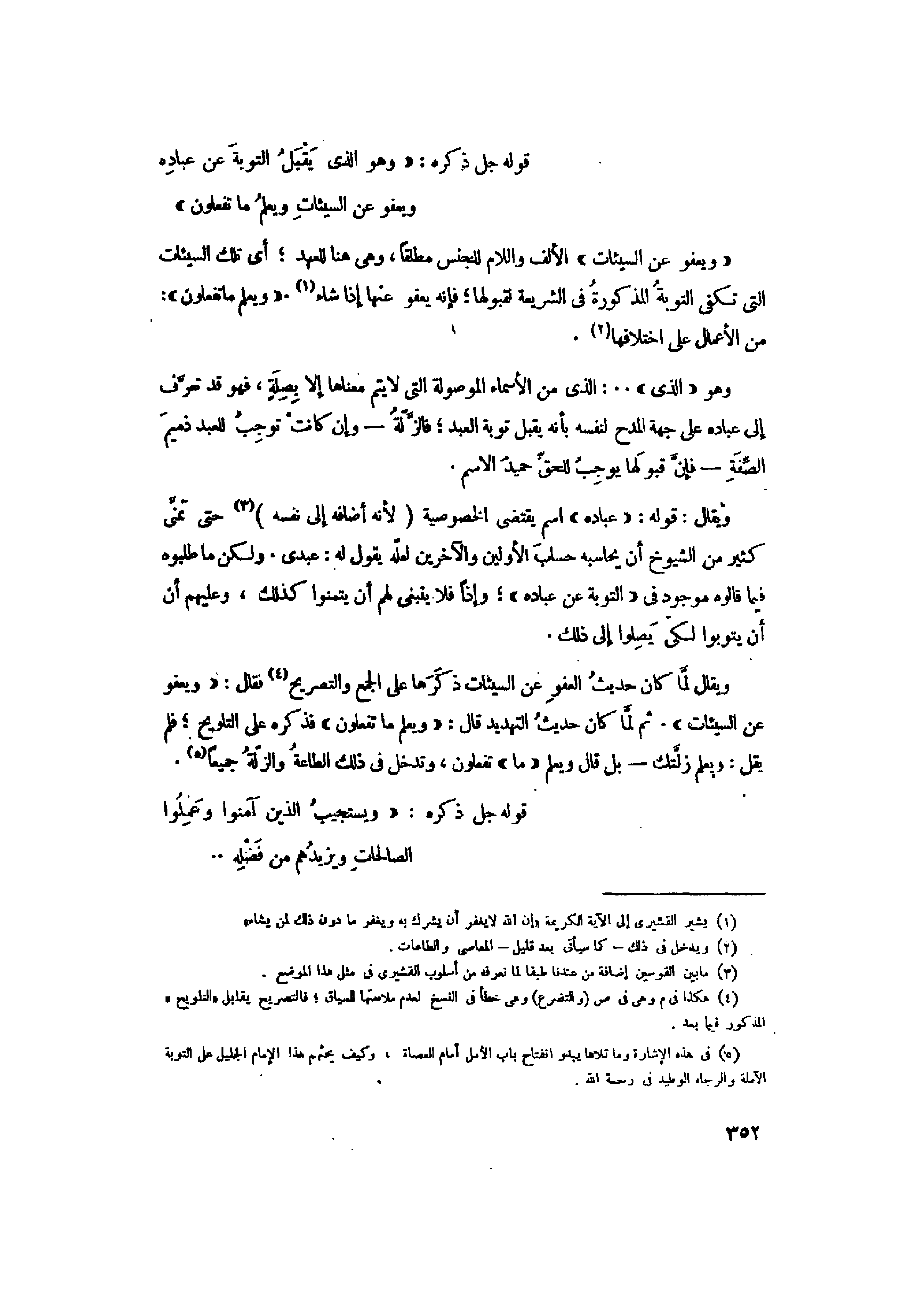 ويقال: قوله: «عِبادِهِ» اسم يقتضى الخصوصية (لأنه أضافه إلى نفسه) «3» حتى تمنّى كثير من الشيوخ أن يحاسبه حساب الأولين والآخرين لعلّه يقول له: عبدى. ولكن ما طلبوه فيما قالوه موجود فى «التَّوْبَةَ عَنْ عِبادِهِ» وإذا فلا ينبغى لهم أن يتمنوا كذلك، وعليهم أن أن يتوبوا لكى يصلوا إلى ذلك.