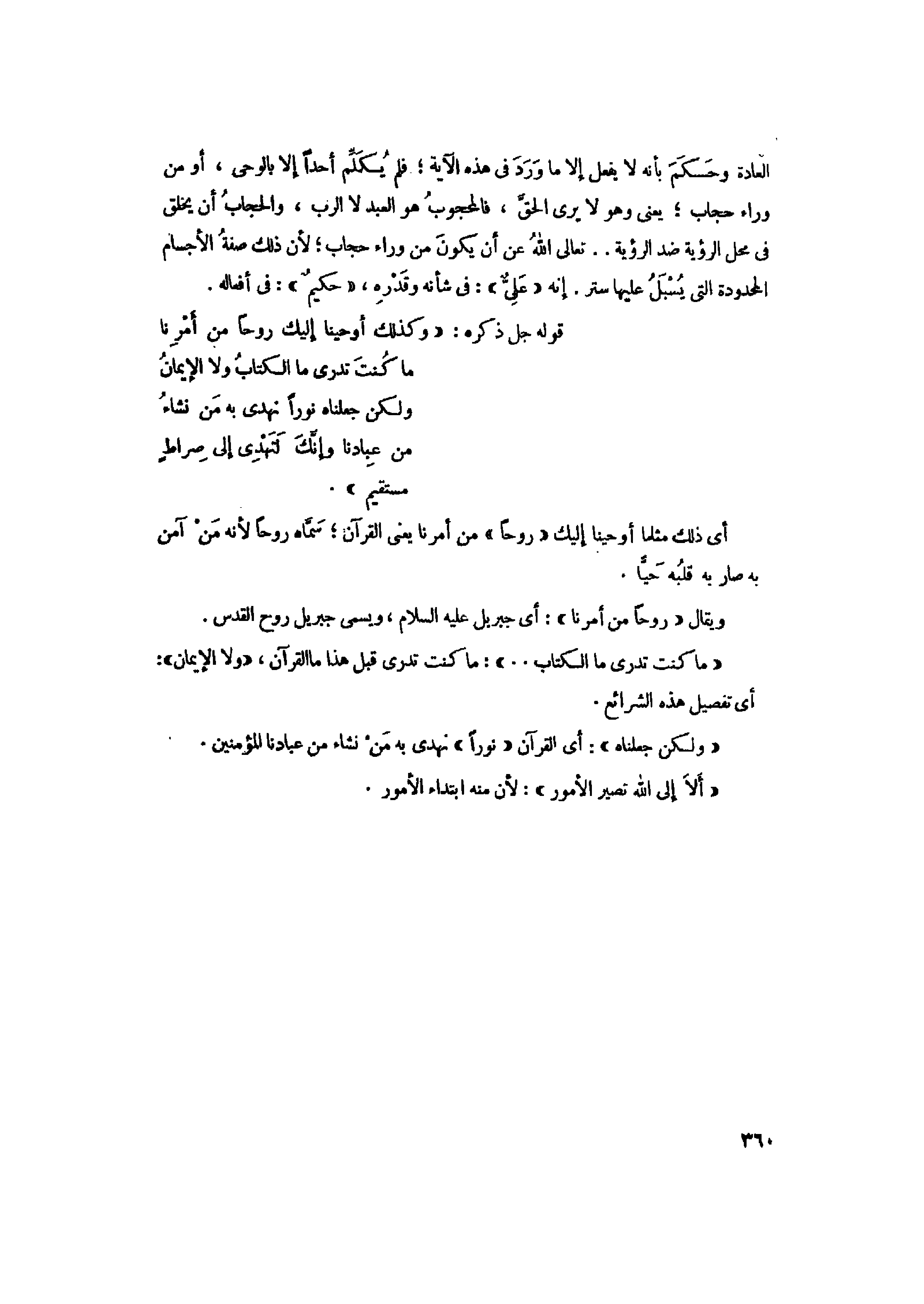 وَكَذلِكَ أَوْحَيْنا إِلَيْكَ رُوحاً مِنْ أَمْرِنا ما كُنْتَ تَدْرِي مَا الْكِتابُ وَلا الْإِيمانُ وَلكِنْ جَعَلْناهُ نُوراً نَهْدِي بِهِ مَنْ نَشاءُ مِنْ عِبادِنا وَإِنَّكَ لَتَهْدِي إِلى صِراطٍ مُسْتَقِيمٍ (52) صِراطِ اللَّهِ الَّذِي لَهُ ما فِي السَّماواتِ وَما فِي الْأَرْضِ أَلا إِلَى اللَّهِ تَصِيرُ الْأُمُورُ (53)