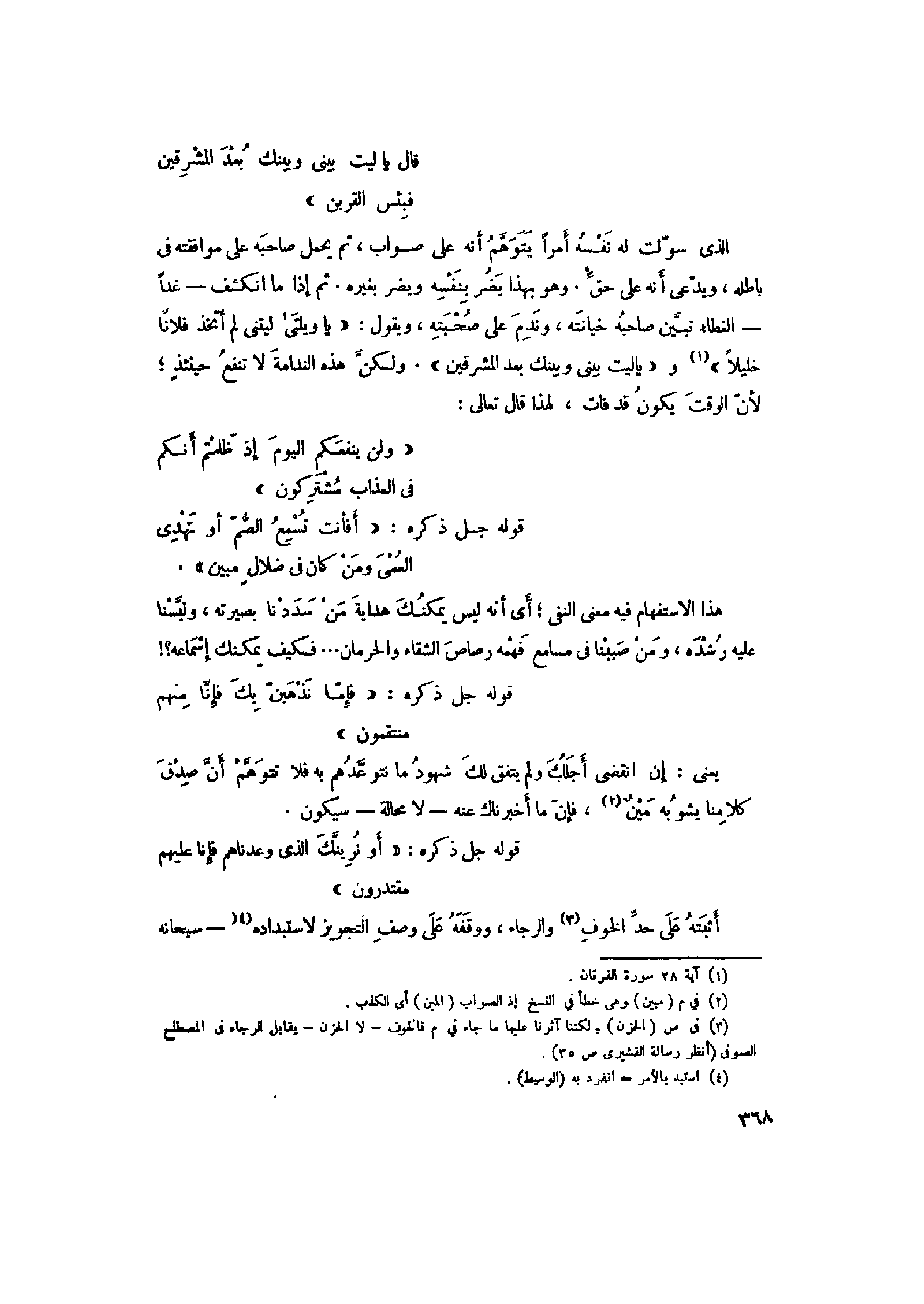 (3) فى ص (الحزن) : لكننا آثرنا عليها ما جاء في م فالخوف- لا الحزن- يقابل الرجاء في المصطلح الصوفي (أنظر رسالة القشيري ص 35) .