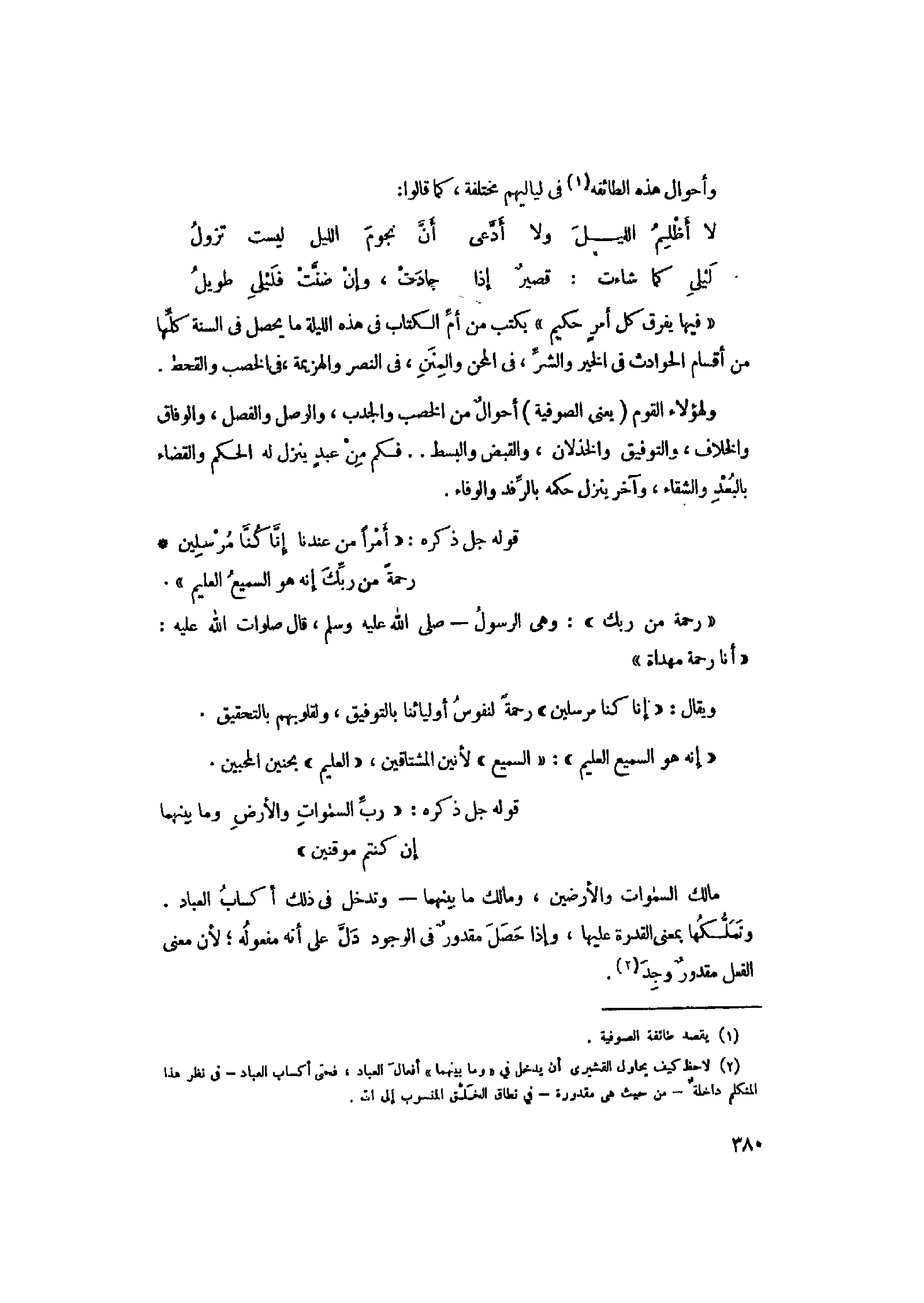 (2) لا حظ كيف يحاول القشيري أن يدخل في «وما بينهما» أفعال العباد، فحتى أكساب العباد- فى نظر هذا المتكلم داخلة- من حيث هي مقدورة- فى نطاق الخلق المنسوب إلى الله.