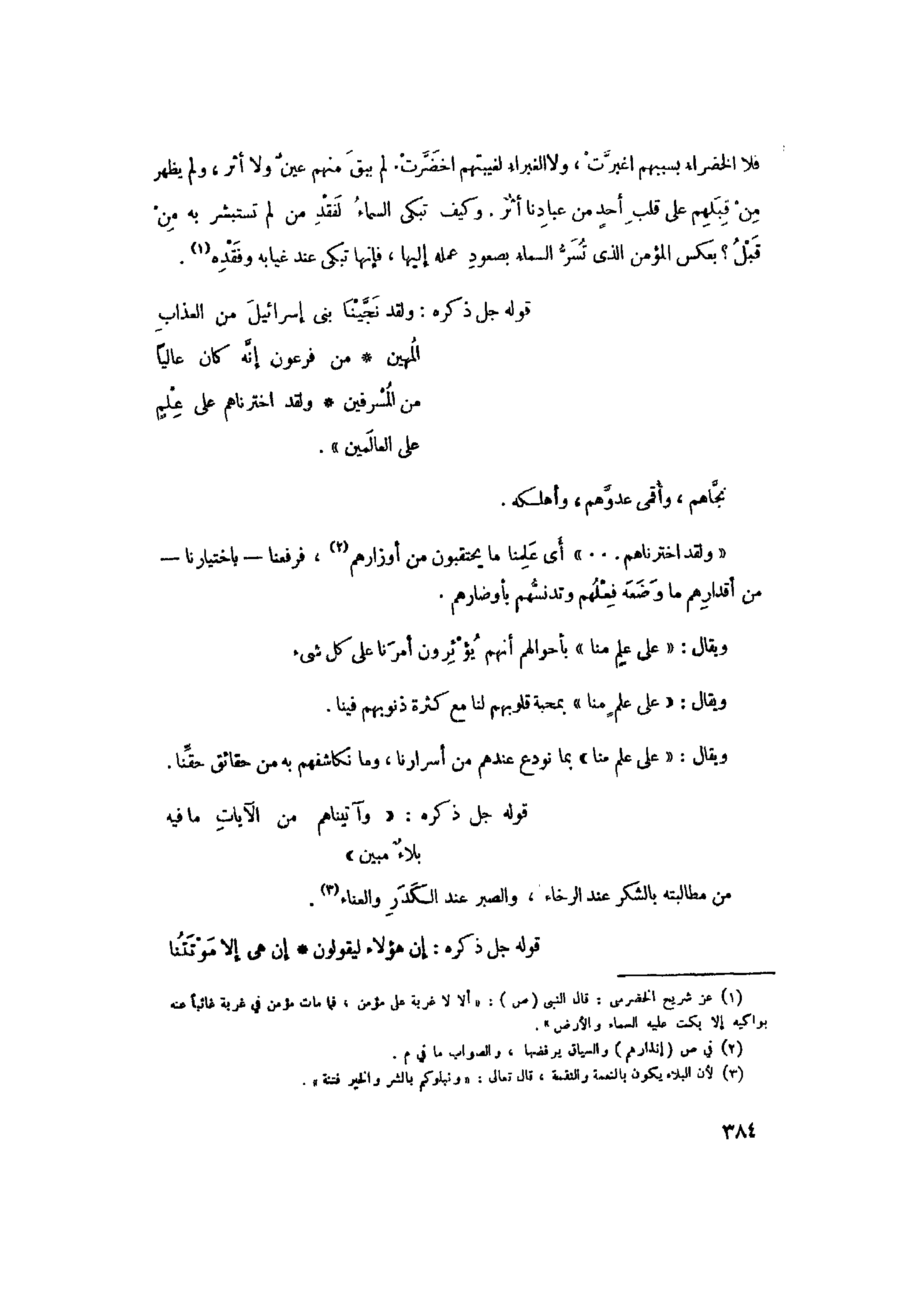 (3) لأن البلاء يكون بالنعمة والنقمة، قال تعالى: «وَنَبْلُوكُمْ بِالشَّرِّ وَالْخَيْرِ فِتْنَةً» .