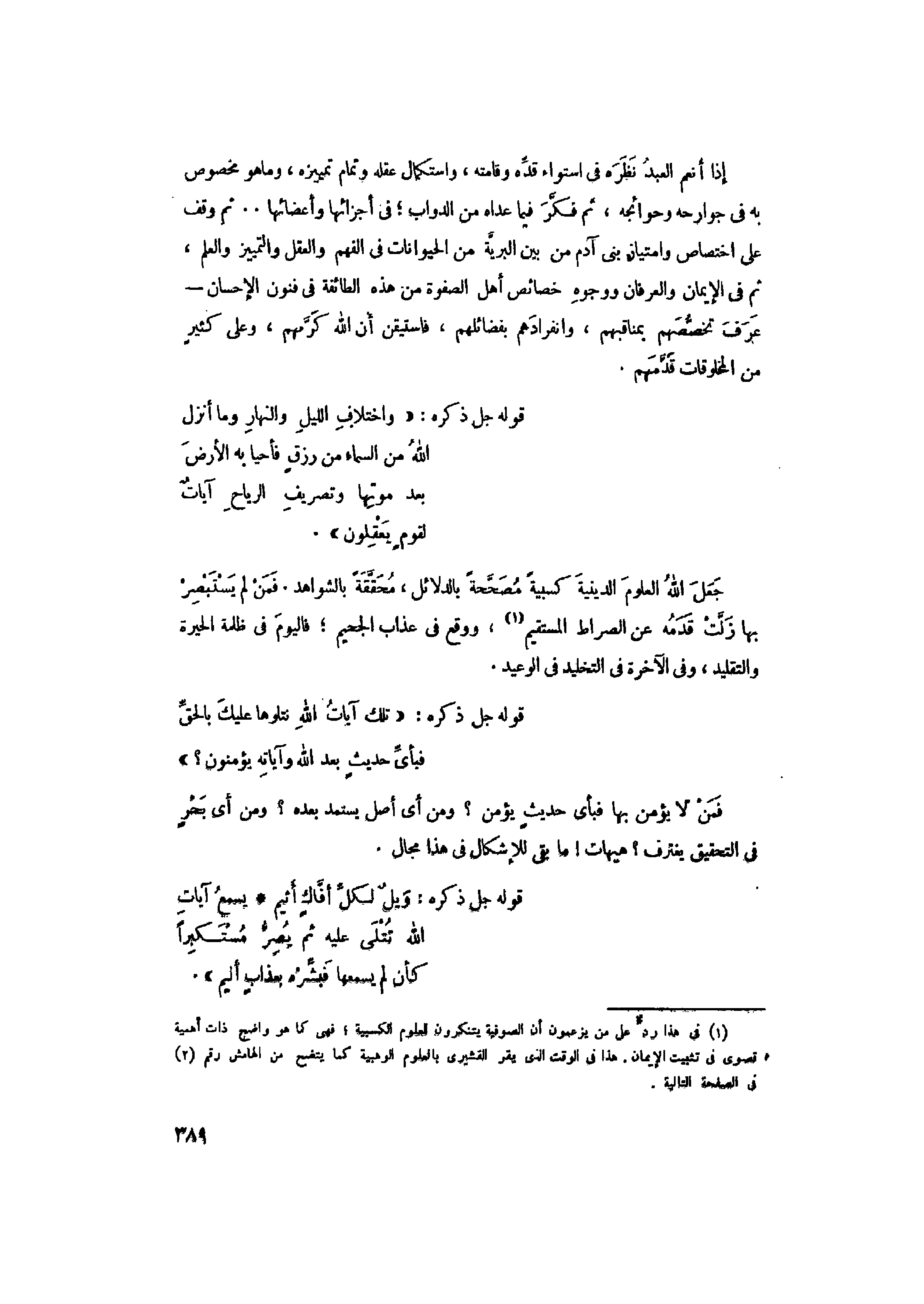 جعل الله العلوم الدينية كسبية مصحّحة بالدلائل، محقّقة بالشواهد. فمن لم يستبصر بها زلّت قدمه عن الصراط المستقيم «1» ، ووقع في عذاب الجحيم فاليوم في ظلمة الحيرة والتقليد، وفي الآخرة في التخليد في الوعيد.
