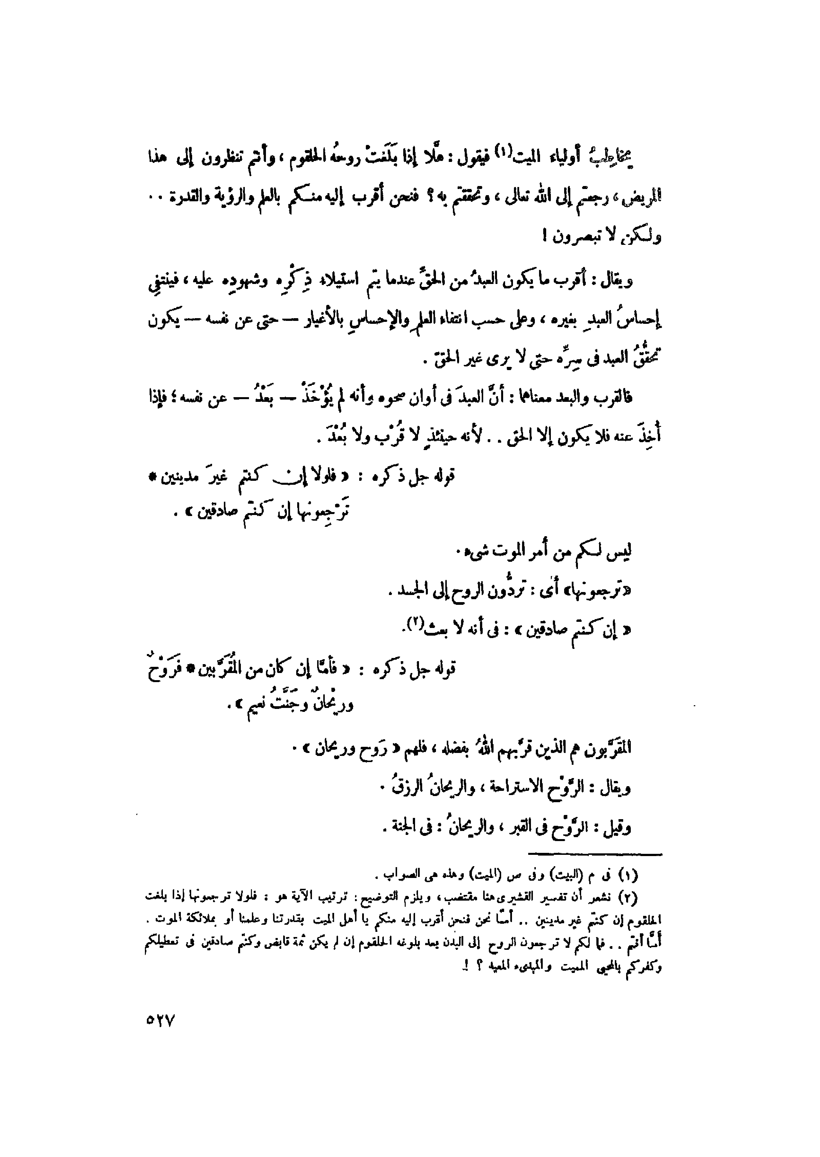 (2) نشعر أن تفسير القشيري هنا مقتضب، ويلزم التوضيح: ترتيب الآية هو: فلولا ترجعونها إذا بلغت الحلقوم إن كنتم غير مدينين.. أمّا نحن فنحن أقرب إليه منكم يا أهل الميت بقدرتنا وعلمنا أو بملائكة الموت.