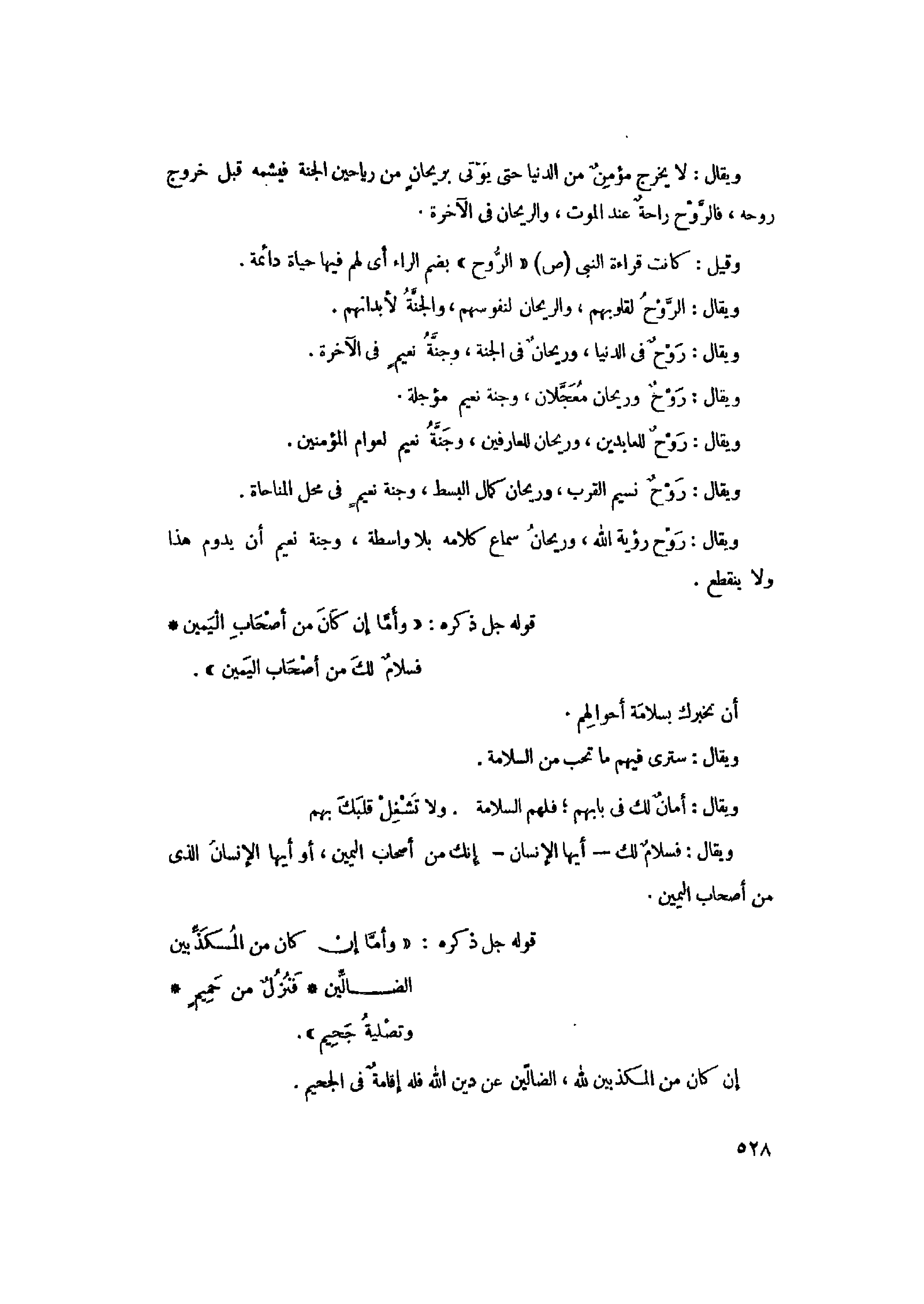 ويقال: لا يخرج مؤمن من الدنيا حتى يؤتى بريحان من رياحين الجنة فيشمه قبل خروج روحه، فالرّوح راحة عند الموت، والريحان في الآخرة.