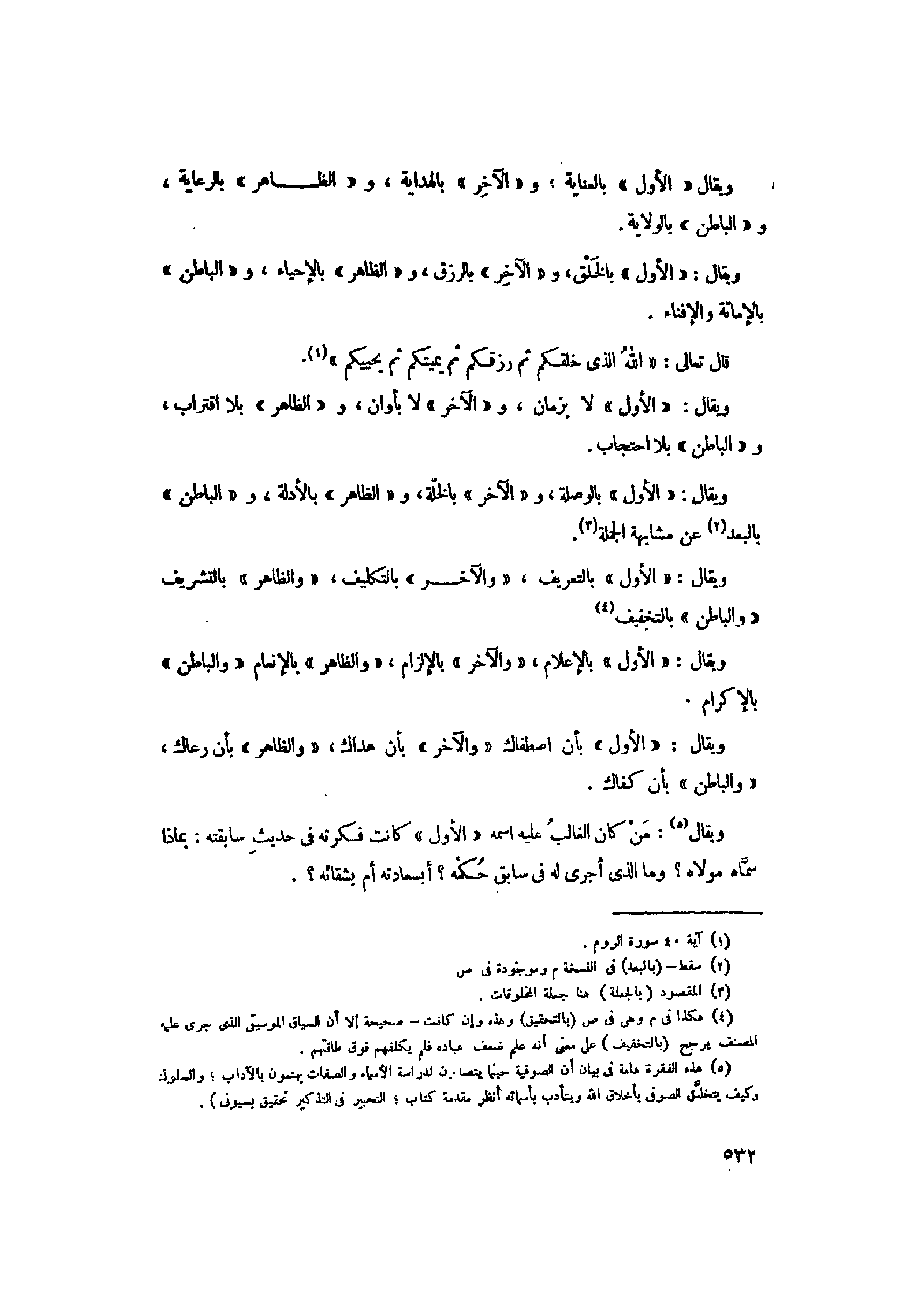 (5) هذه الفقرة هامة في بيان أن الصوفية حينما يتصدون لدراسة الأسماء والصفات يهتمون بالآداب والسلوك وكيف يتخلّق الصوفي بأخلاق الله ويتأدب بأسمائه أنظر مقدمة كتاب التحبير في التذكير تحقيق بسيونى) .