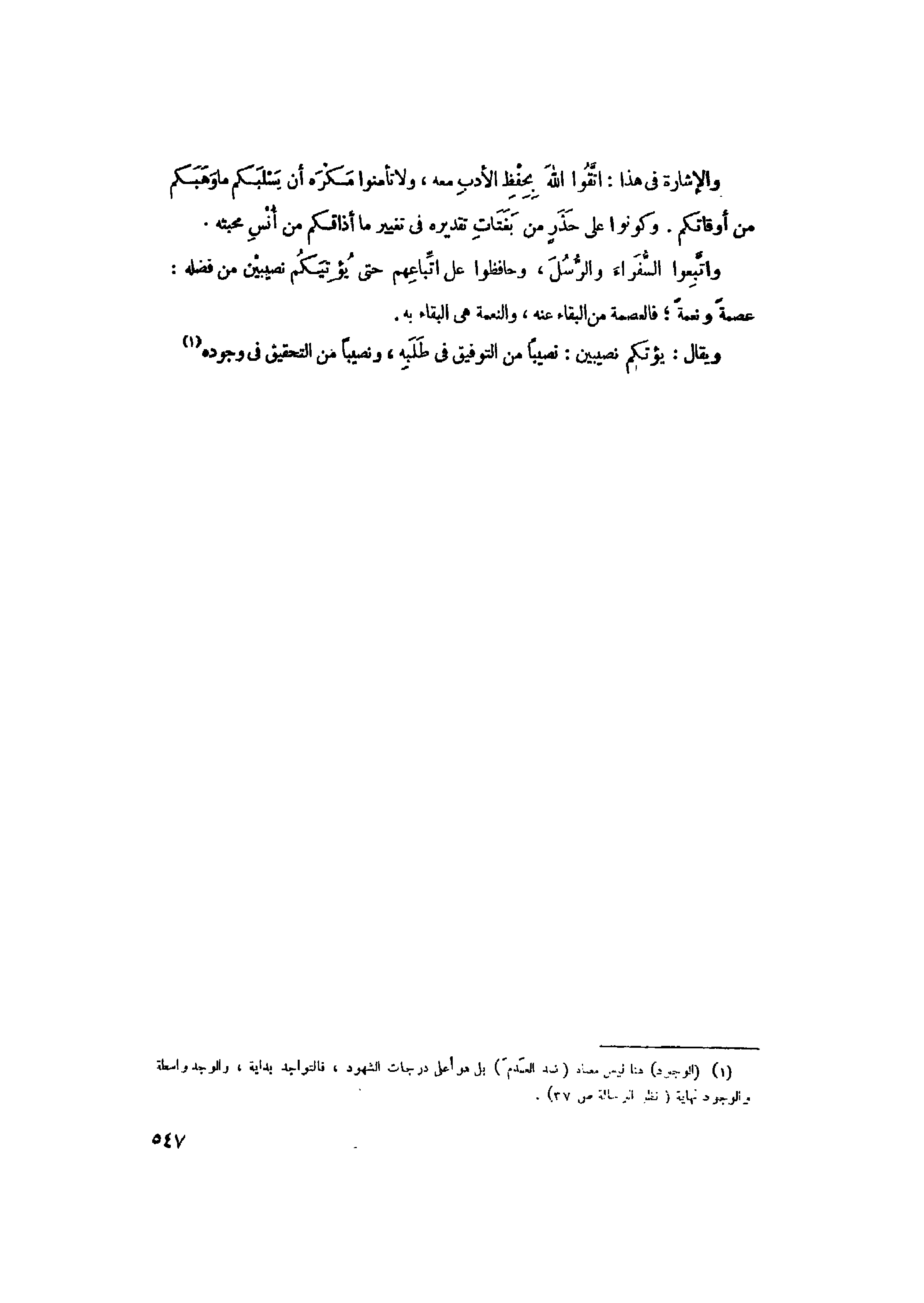 (1) (الوجود) هنا ليس معناه (ضد العدم) بل هو أعلى درجات الشهود، فالتواجد بداية، والوجد واسطة والوجود نهاية (انظر الرسالة ص 37) .
