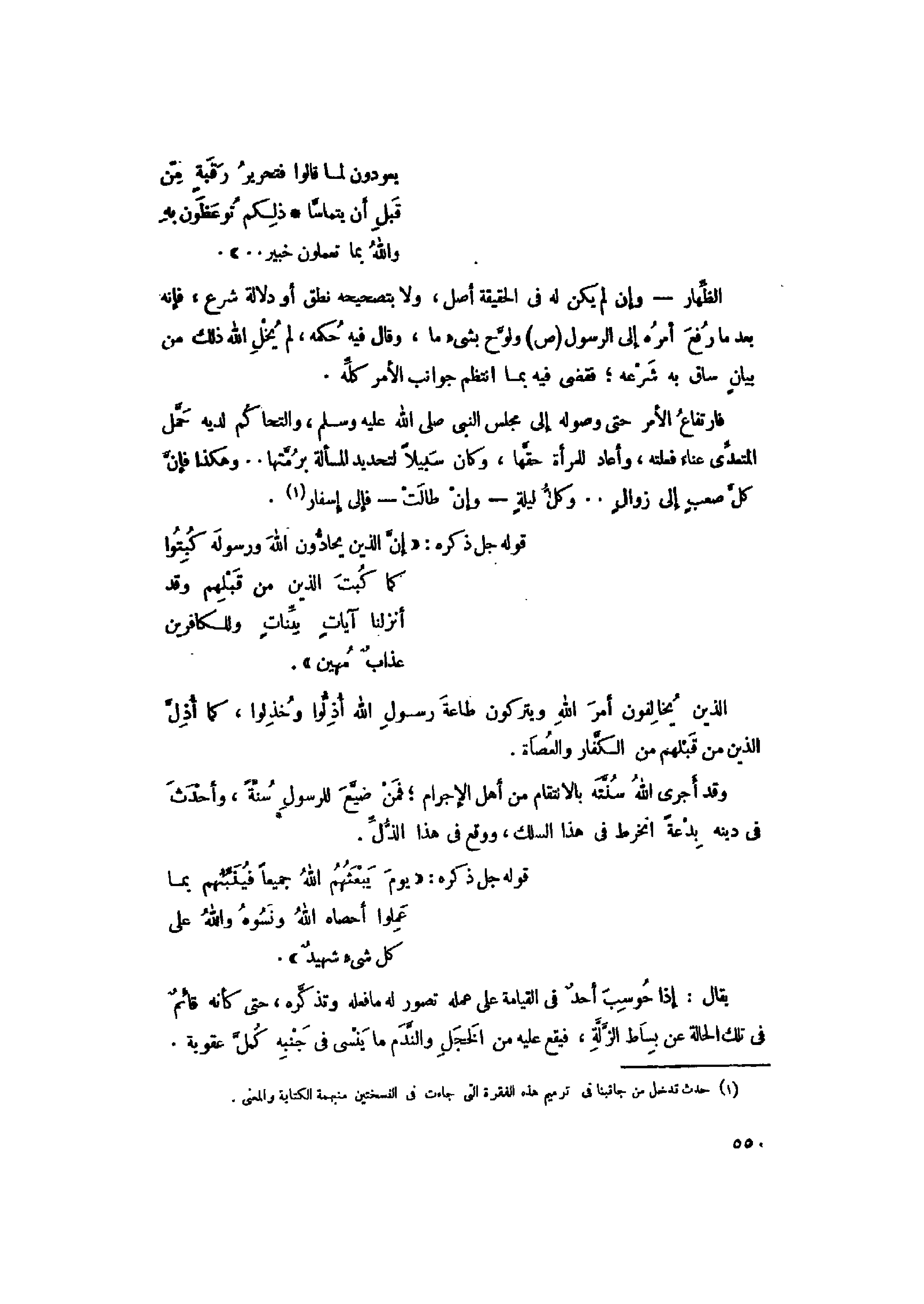 الظّهار- وإن لم يكن له في الحقيقة أصل، ولا بتصحيحه نطق أو دلالة شرع، فإنه بعد ما رفع أمره إلى الرسول (ص) ولوّح بشىء ما، وقال فيه حكمه، لم يخل الله ذلك من بيان ساق به شرعه فقضى فيه بما انتظم جوانب الأمر كلّه.