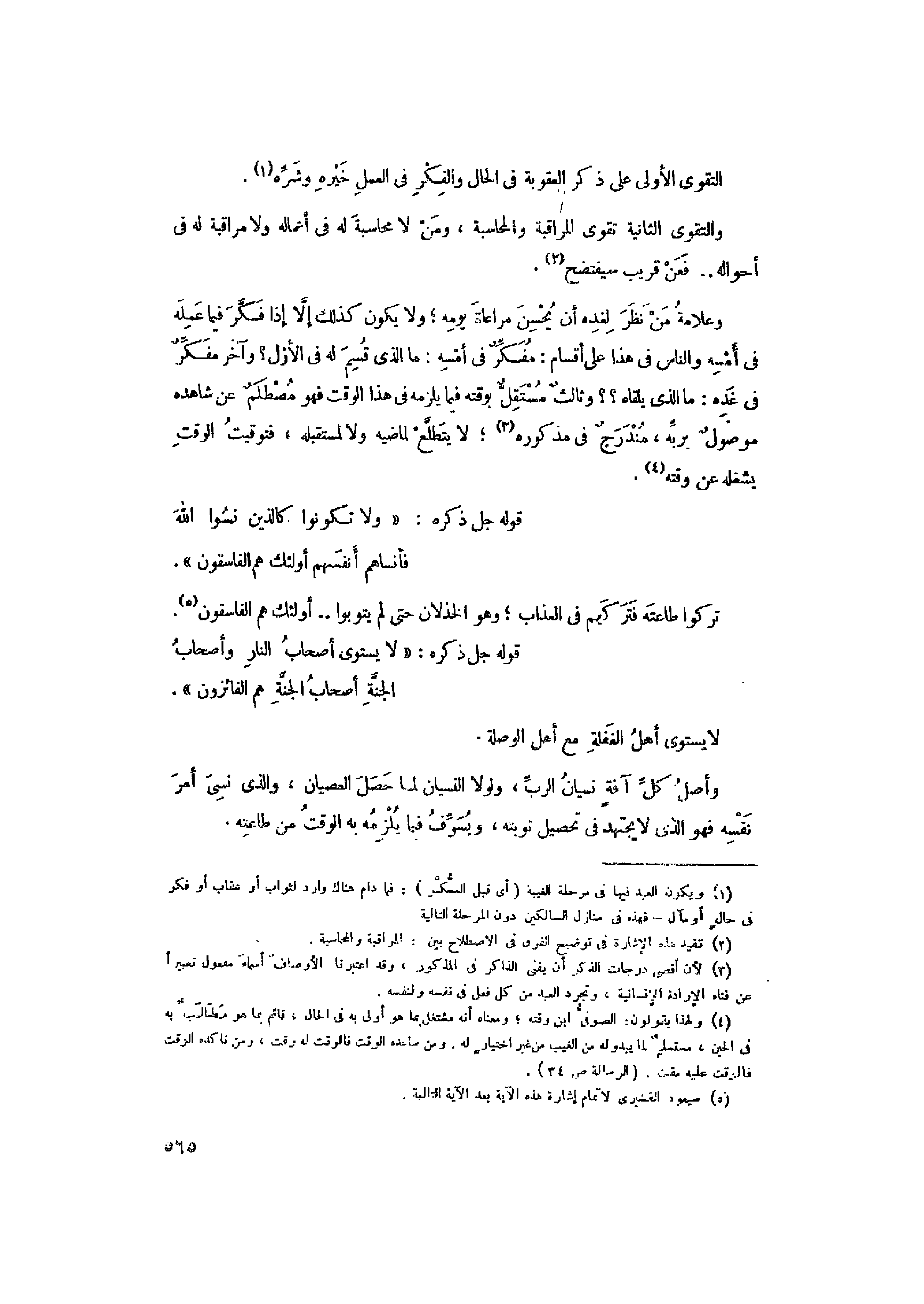 وعلامة من نظر لغده أن يحسن مراعاة يومه ولا يكون كذلك إلّا إذا فكّر فيما عمله فى أمسه والناس في هذا على أقسام: مفكّر في أمسه: ما الذي قسم له في الأزل؟ وآخر مفكّر فى غده: ما الذي يلقاه؟؟ وثالث مستقل بوقته فيما يلزمه في هذا الوقت فهو مصطلم عن شاهده موصول بربّه، مندرج في مذكوره «3» لا يتطلّع لماضيه ولا لمستقبله، فتوقيت الوقت يشغله عن وقته «4» .