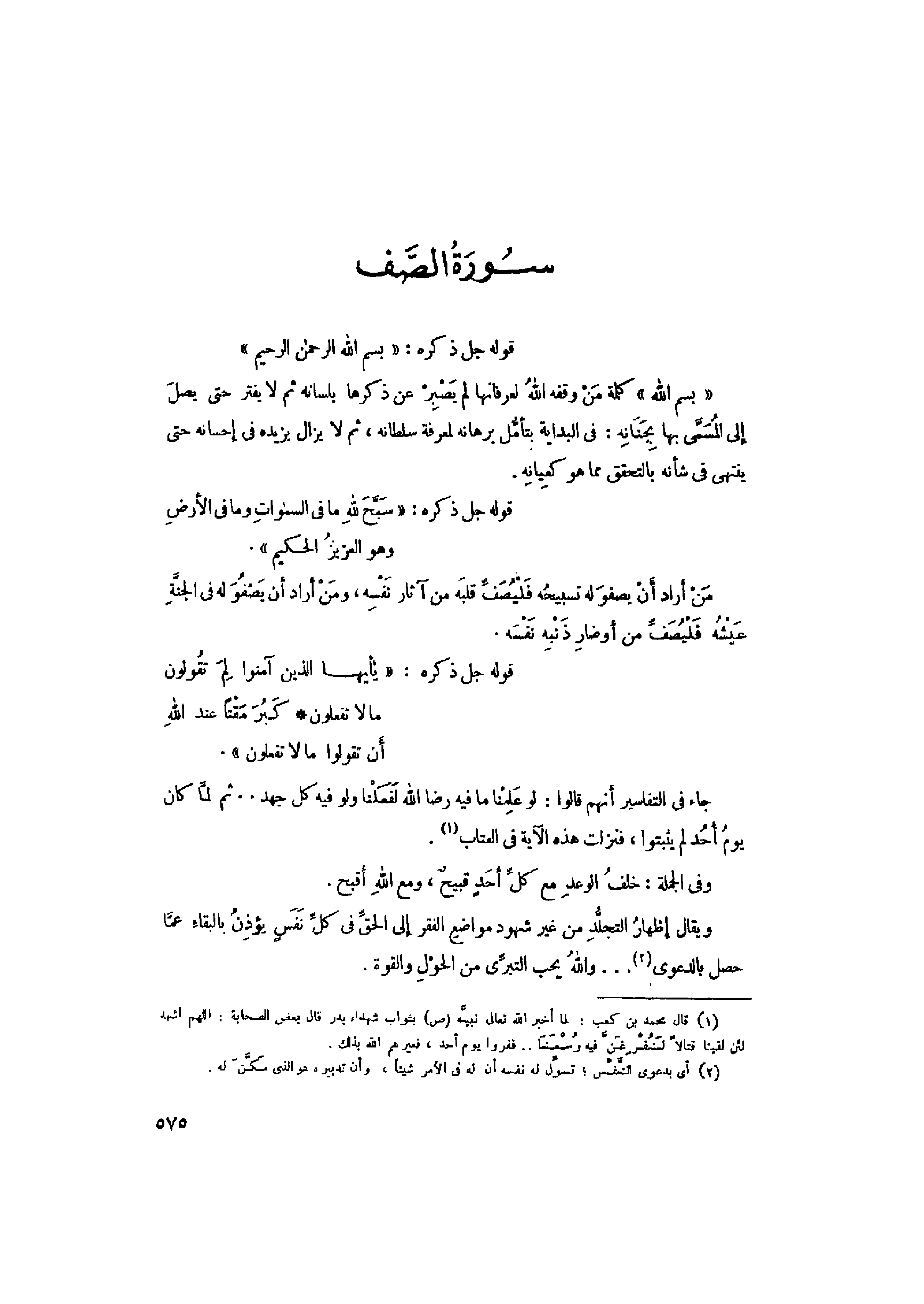 قوله جل ذكره: «بِسْمِ اللَّهِ الرَّحْمنِ الرَّحِيمِ» «بِسْمِ اللَّهِ» كلمة من وقفه الله لعرفانها لم يصبر عن ذكرها بلسانه ثم لا يفتر حتى يصل إلى المسمّى بها بجنانه: فى البداية بتأمّل برهانه لمعرفة سلطانه، ثم لا يزال يزيده في إحسانه حتى ينتهى في شأنه بالتحقق مما هو كعيانه.