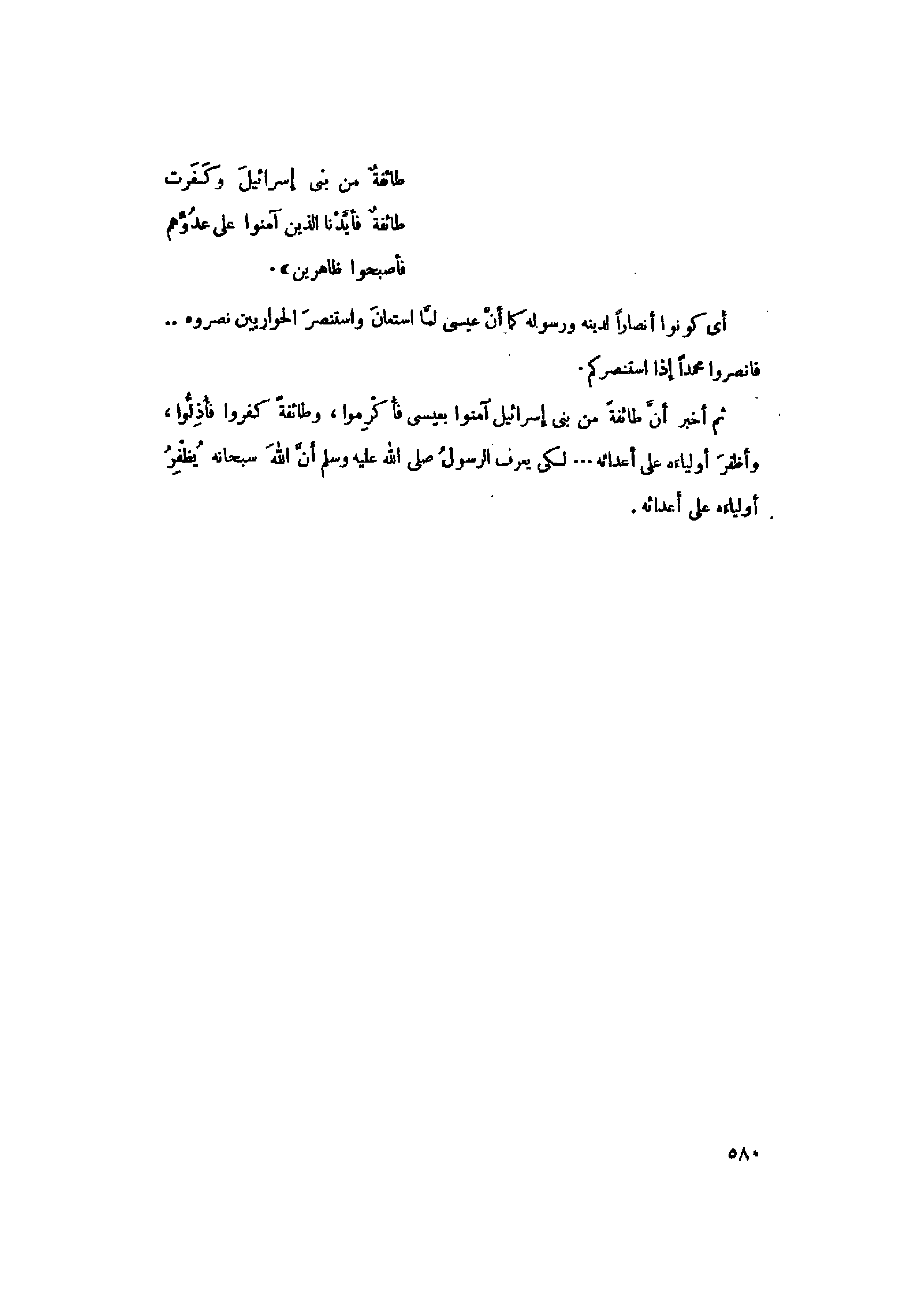 ثم أخبر أنّ طائفة من بنى إسرائيل آمنوا بعيسى فأكرموا، وطائفة كفروا فأذلّوا، وأظفر أولياء على أعدائه ... لكى يعرف الرسول صلى الله عليه وسلم أنّ الله سبحانه يظفر أولياءه على أعدائه.