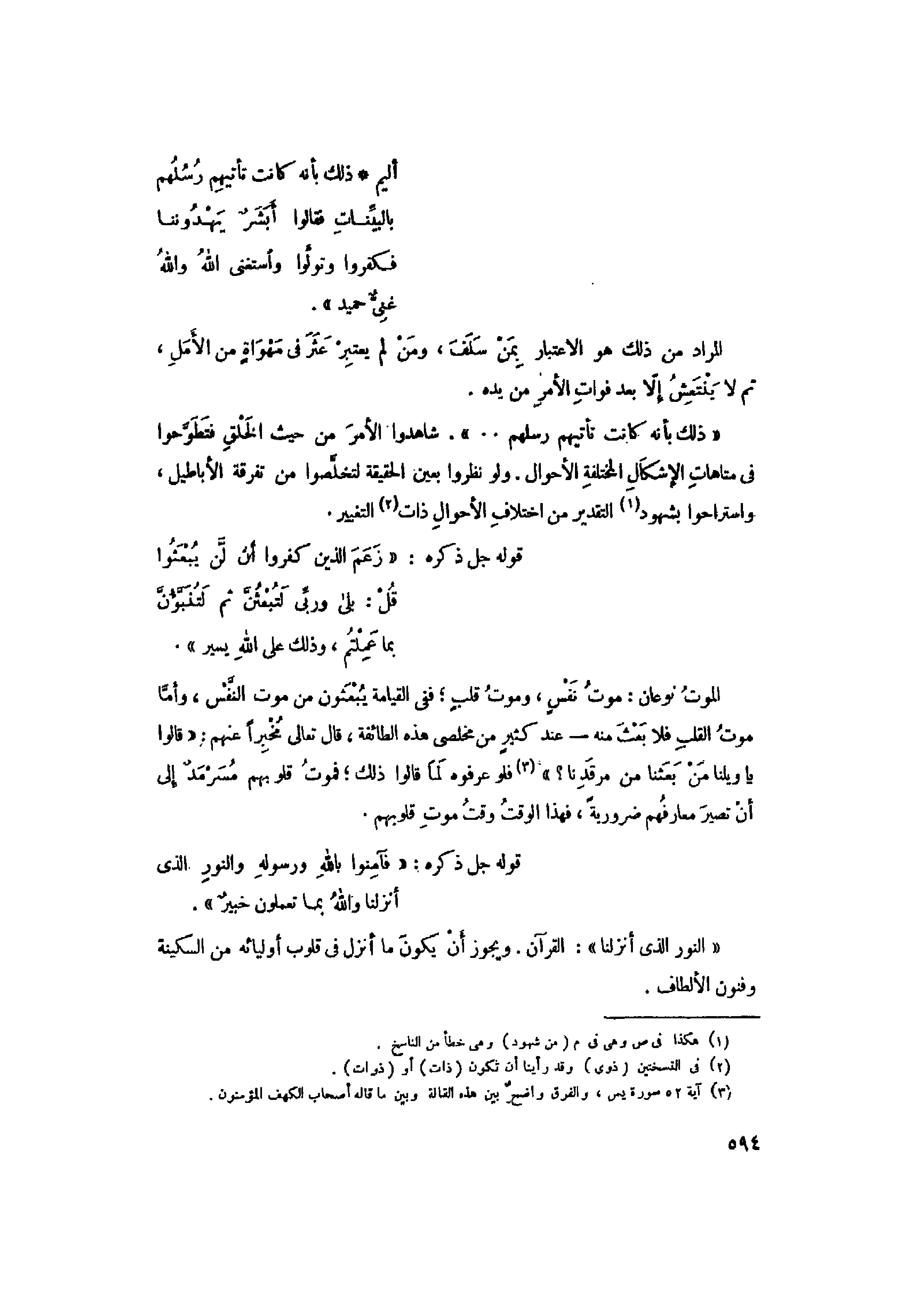 «النُّورِ الَّذِي أَنْزَلْنا» : القرآن. ويجوز أن يكون ما أنزل في قلوب أوليائه من السكينة وفنون الألطاف.