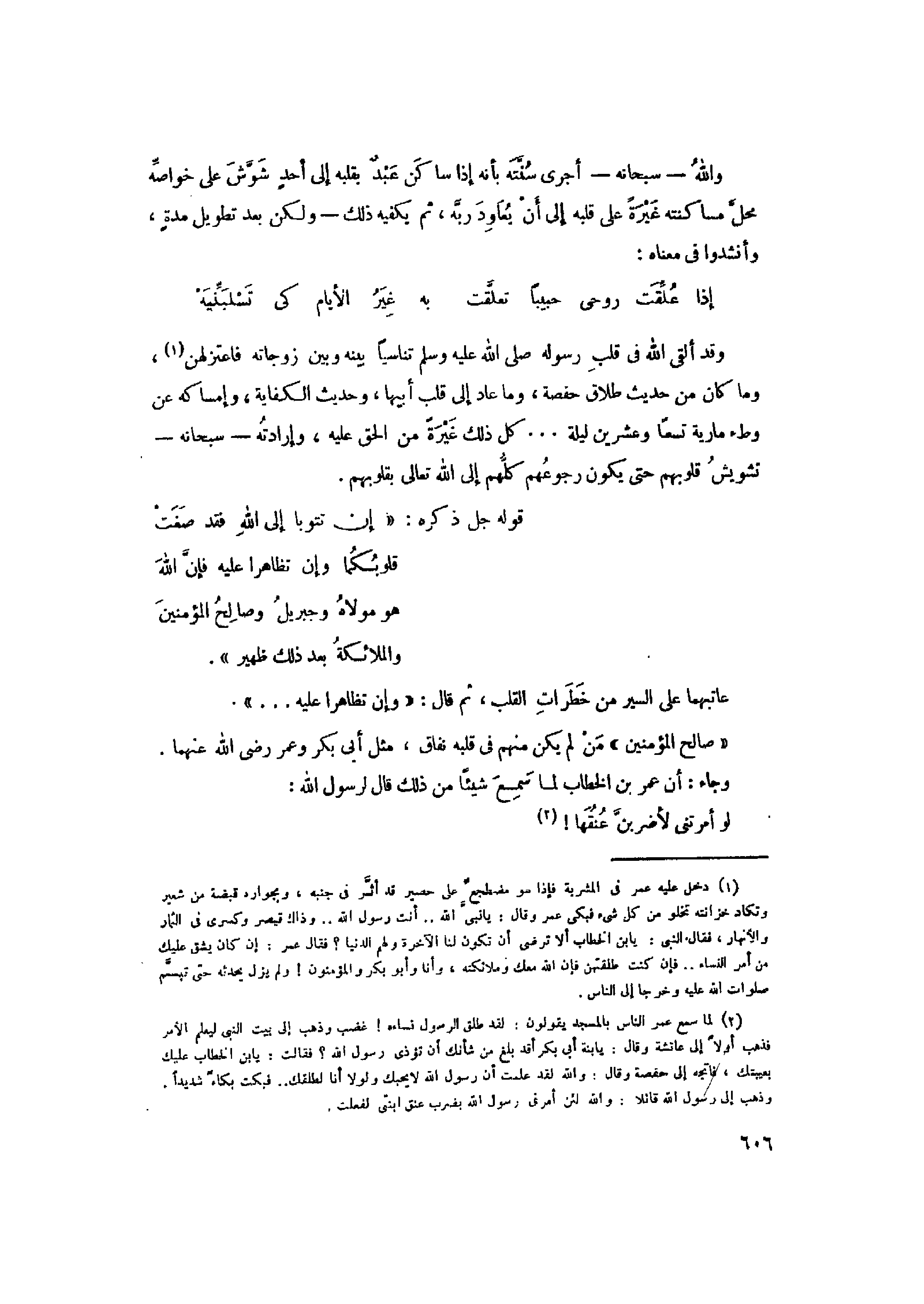 وقد ألقى الله في قلب رسوله صلى الله عليه وسلم تناسيا بينه وبين زوجاته فاعتزلهن «1» ، وما كان من حديث طلاق حفصة، وما عاد إلى قلب أبيها، وحديث الكفاية، وإمساكه عن وطء مارية تسعا وعشرين ليلة ... كل ذلك غيرة من الحق عليه، وإرادته- سبحانه- تشويش قلوبهم حتى يكون رجوعهم كلّهم إلى الله تعالى بقلوبهم.