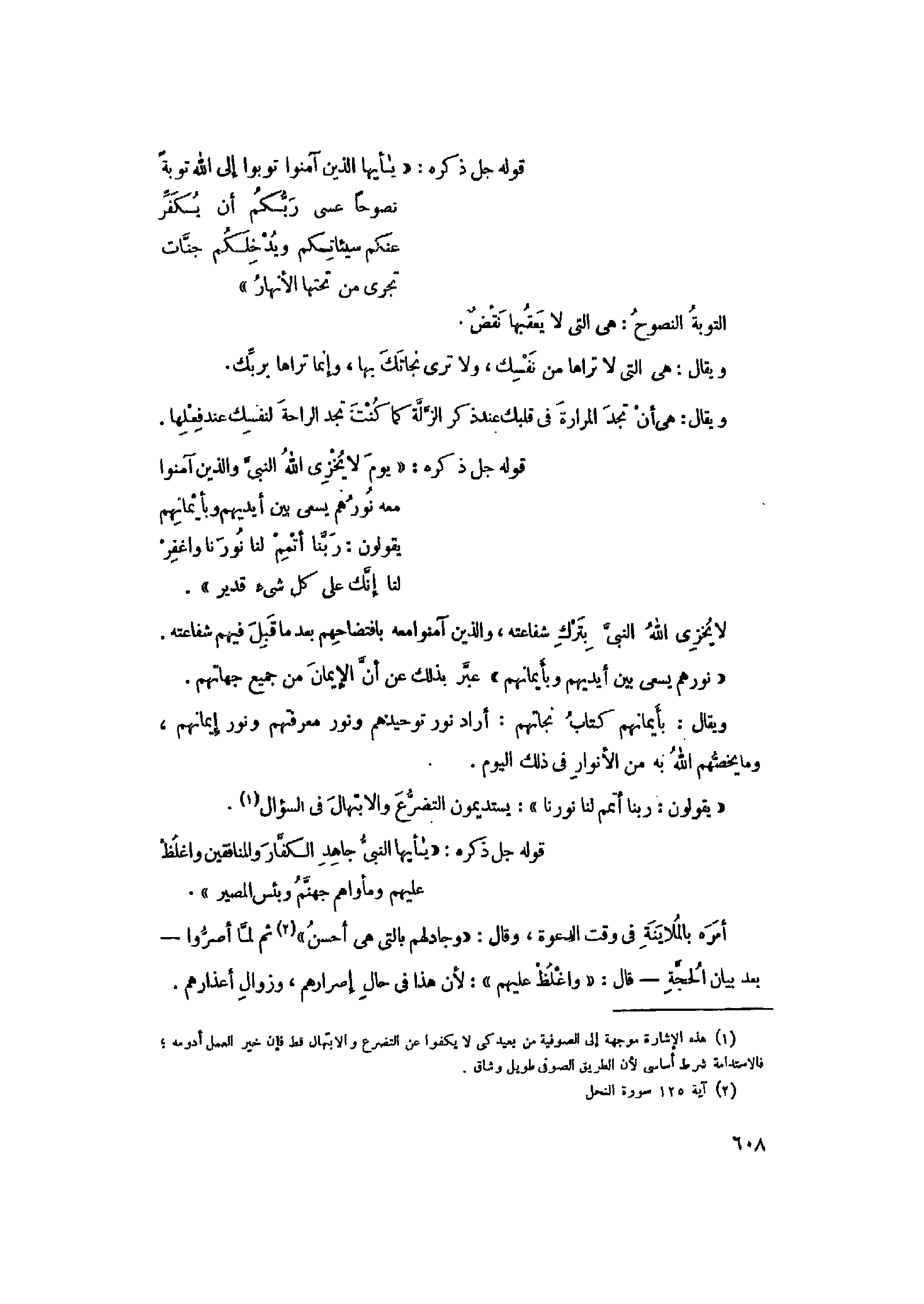 قوله جل ذكره: «يَوْمَ لا يُخْزِي اللَّهُ النَّبِيَّ وَالَّذِينَ آمَنُوا مَعَهُ نُورُهُمْ يَسْعى بَيْنَ أَيْدِيهِمْ وَبِأَيْمانِهِمْ يَقُولُونَ: رَبَّنا أَتْمِمْ لَنا نُورَنا وَاغْفِرْ لَنا إِنَّكَ عَلى كُلِّ شَيْءٍ قَدِيرٌ» .