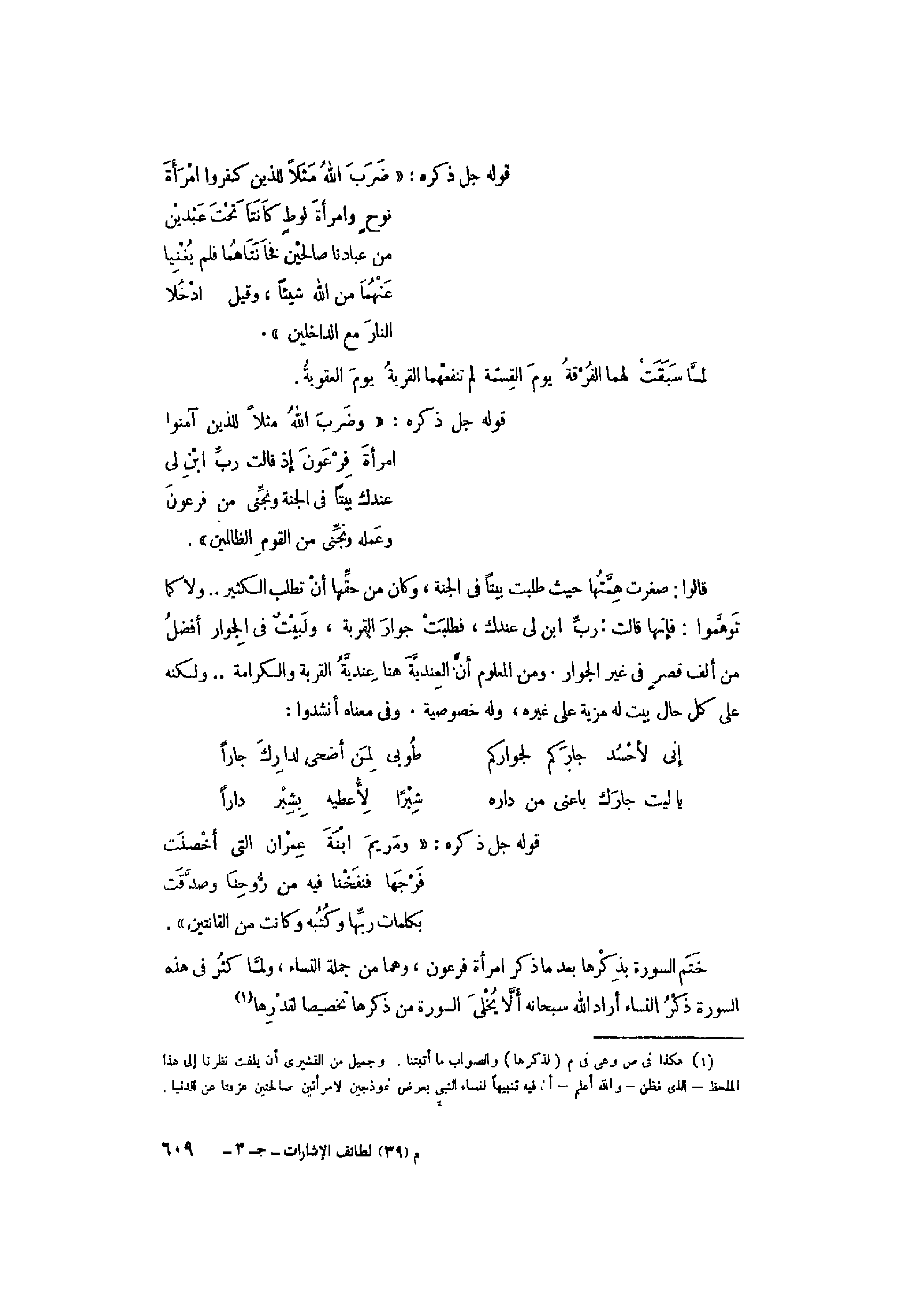(1) هكذا في ص وهي في م (لذكرها) والصواب ما أثبتنا. وجميل من القشيري أن يلفت نظرنا إلى هذا الملحظ- الذي فظن- والله أعلم- أن فيه تنبيها لنساء النبي بعرض نموذجين لامرأتين صالحتين عزفتا عن الدنيا.