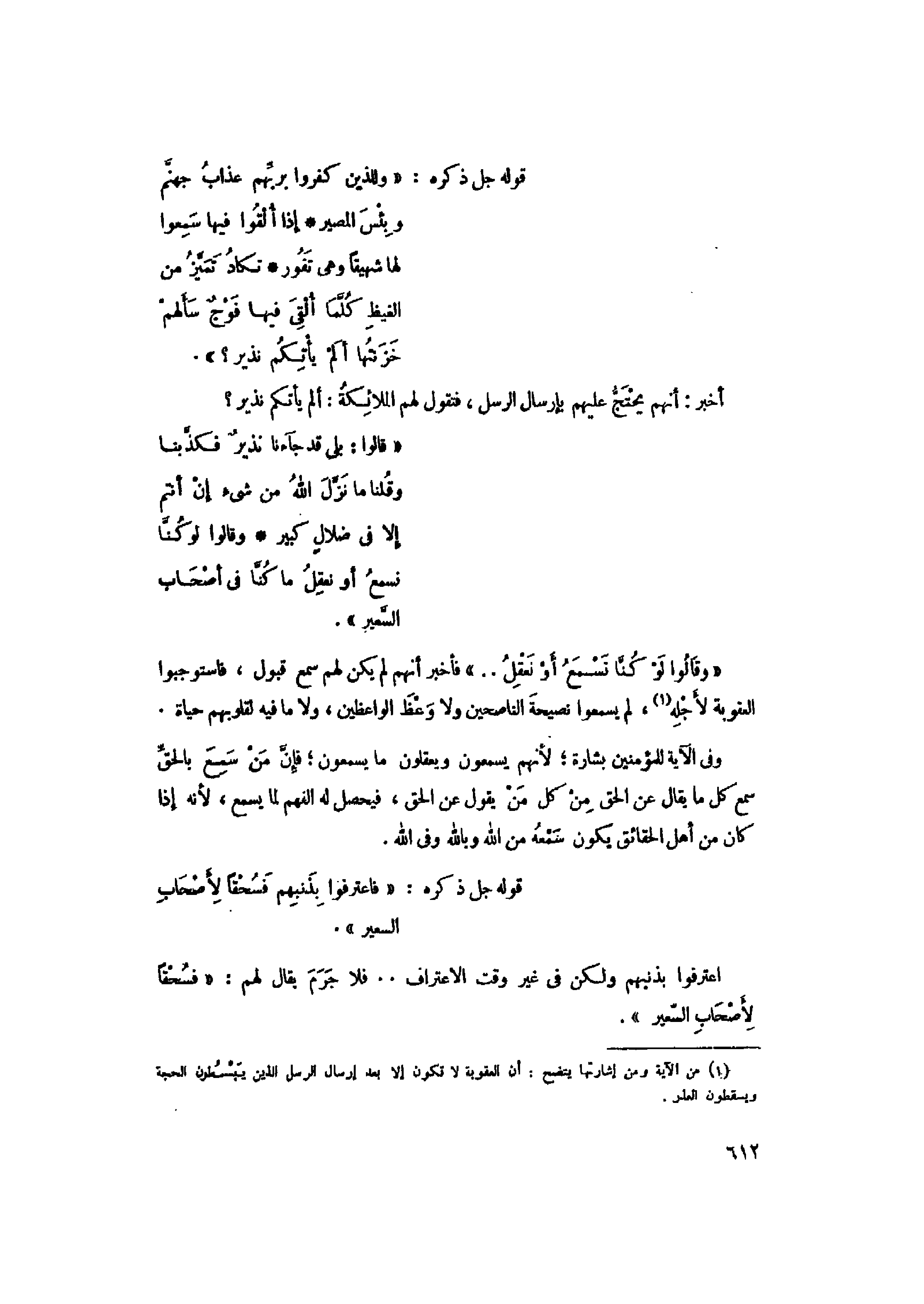 وَلِلَّذِينَ كَفَرُوا بِرَبِّهِمْ عَذابُ جَهَنَّمَ وَبِئْسَ الْمَصِيرُ (6) إِذا أُلْقُوا فِيها سَمِعُوا لَها شَهِيقاً وَهِيَ تَفُورُ (7) تَكادُ تَمَيَّزُ مِنَ الْغَيْظِ كُلَّما أُلْقِيَ فِيها فَوْجٌ سَأَلَهُمْ خَزَنَتُها أَلَمْ يَأْتِكُمْ نَذِيرٌ (8) قالُوا بَلى قَدْ جاءَنا نَذِيرٌ فَكَذَّبْنا وَقُلْنا ما نَزَّلَ اللَّهُ مِنْ شَيْءٍ إِنْ أَنْتُمْ إِلاَّ فِي ضَلالٍ كَبِيرٍ (9) وَقالُوا لَوْ كُنَّا نَسْمَعُ أَوْ نَعْقِلُ ما كُنَّا فِي أَصْحابِ السَّعِيرِ (10)