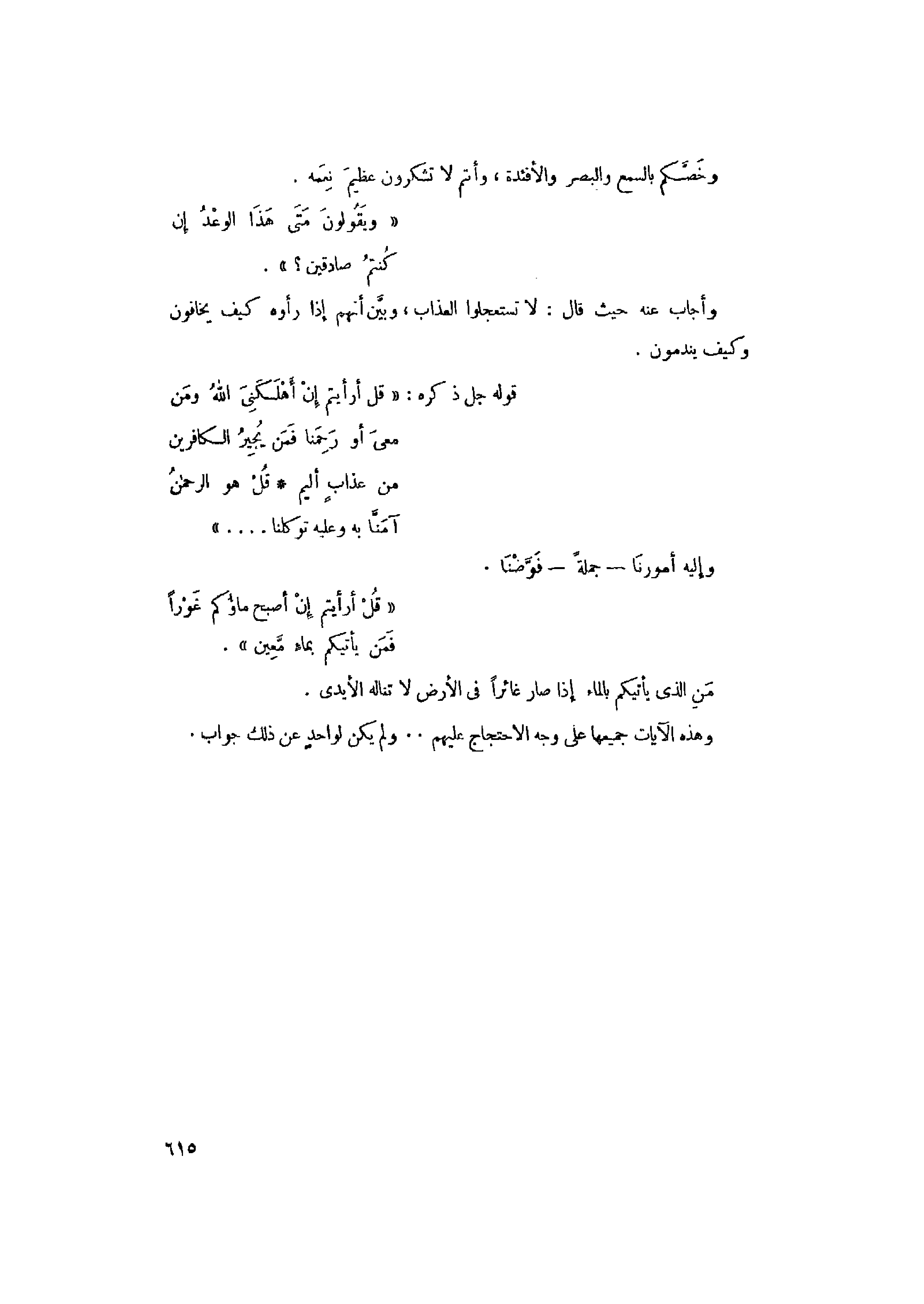 قوله جل ذكره: «قُلْ أَرَأَيْتُمْ إِنْ أَهْلَكَنِيَ اللَّهُ وَمَنْ مَعِيَ أَوْ رَحِمَنا فَمَنْ يُجِيرُ الْكافِرِينَ مِنْ عَذابٍ أَلِيمٍ قُلْ هُوَ الرَّحْمنُ آمَنَّا بِهِ وَعَلَيْهِ تَوَكَّلْنا ... »