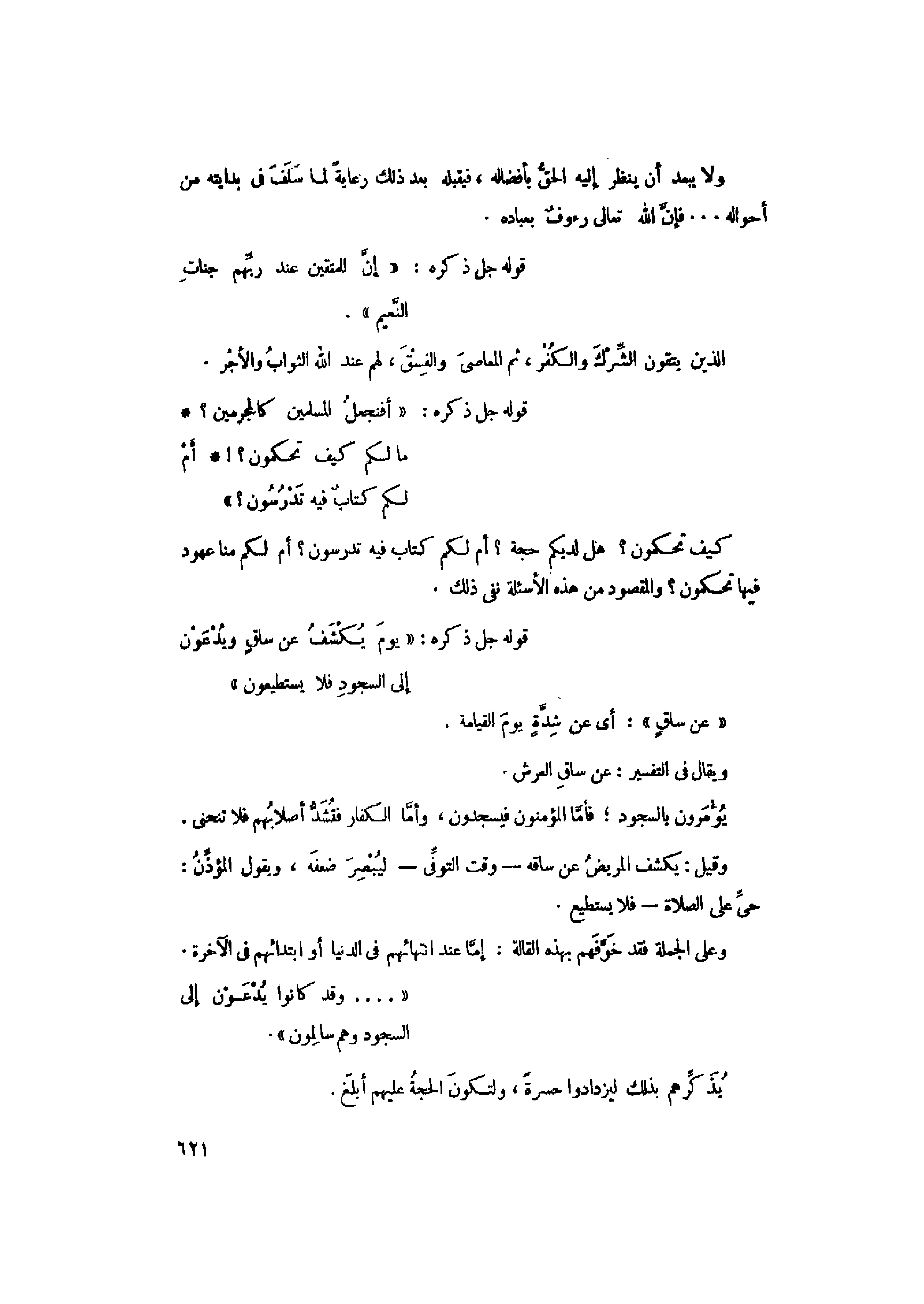 قوله جل ذكره: «أَفَنَجْعَلُ الْمُسْلِمِينَ كَالْمُجْرِمِينَ؟ ما لَكُمْ كَيْفَ تَحْكُمُونَ؟! أَمْ لَكُمْ كِتابٌ فِيهِ تَدْرُسُونَ؟» كيف تحكمون؟ هل لديكم حجة؟ أم لكم كتاب فيه تدرسون؟ أم لكم منا عهود فيها تحكمون؟ والمقصود من هذه الأسئلة نفى ذلك.