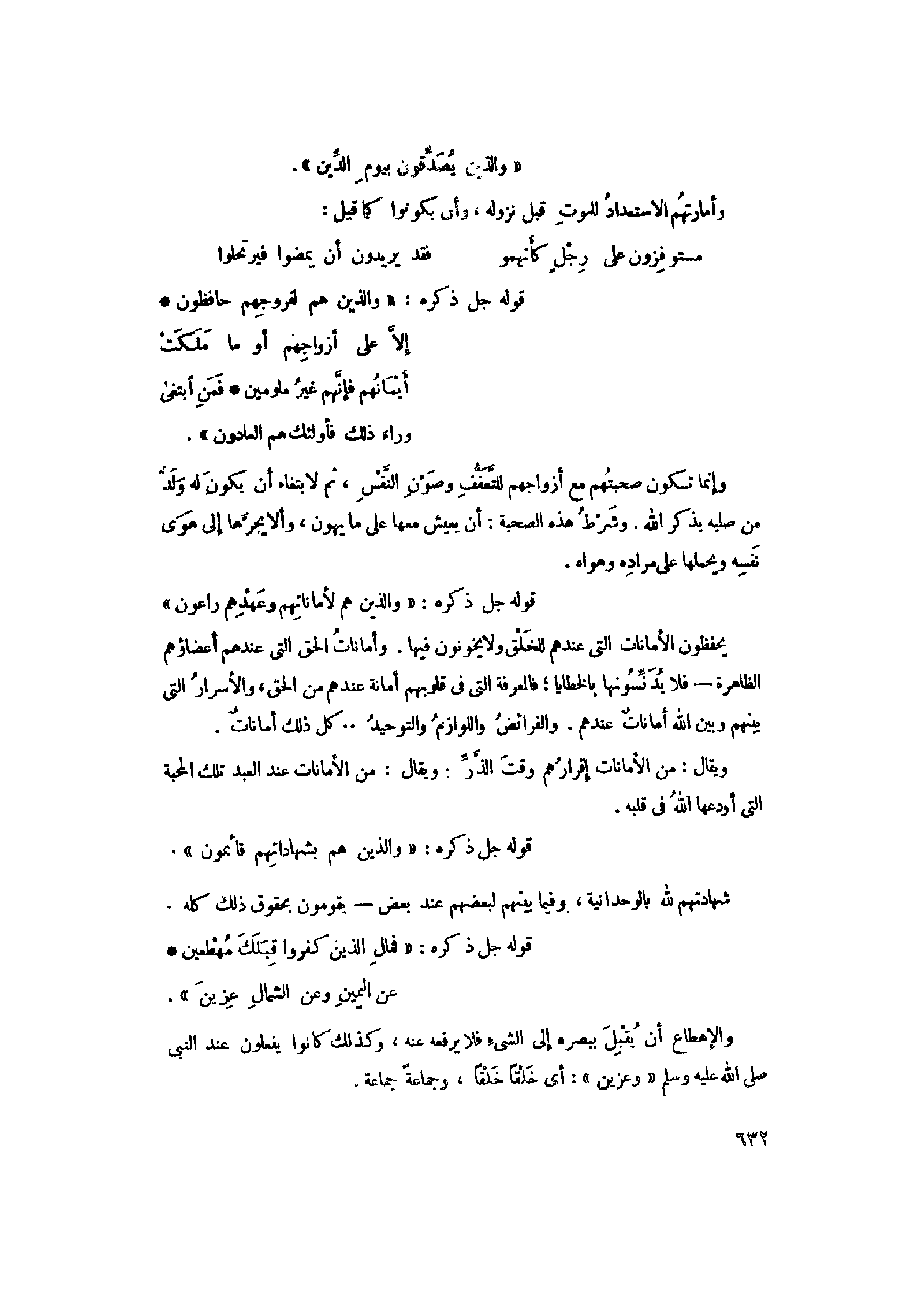 قوله جل ذكره: «وَالَّذِينَ هُمْ بِشَهاداتِهِمْ قائِمُونَ» شهادتهم لله بالوحدانية، وفيما بينهم لبعضهم عند بعض- يقومون بحقوق ذلك كله.