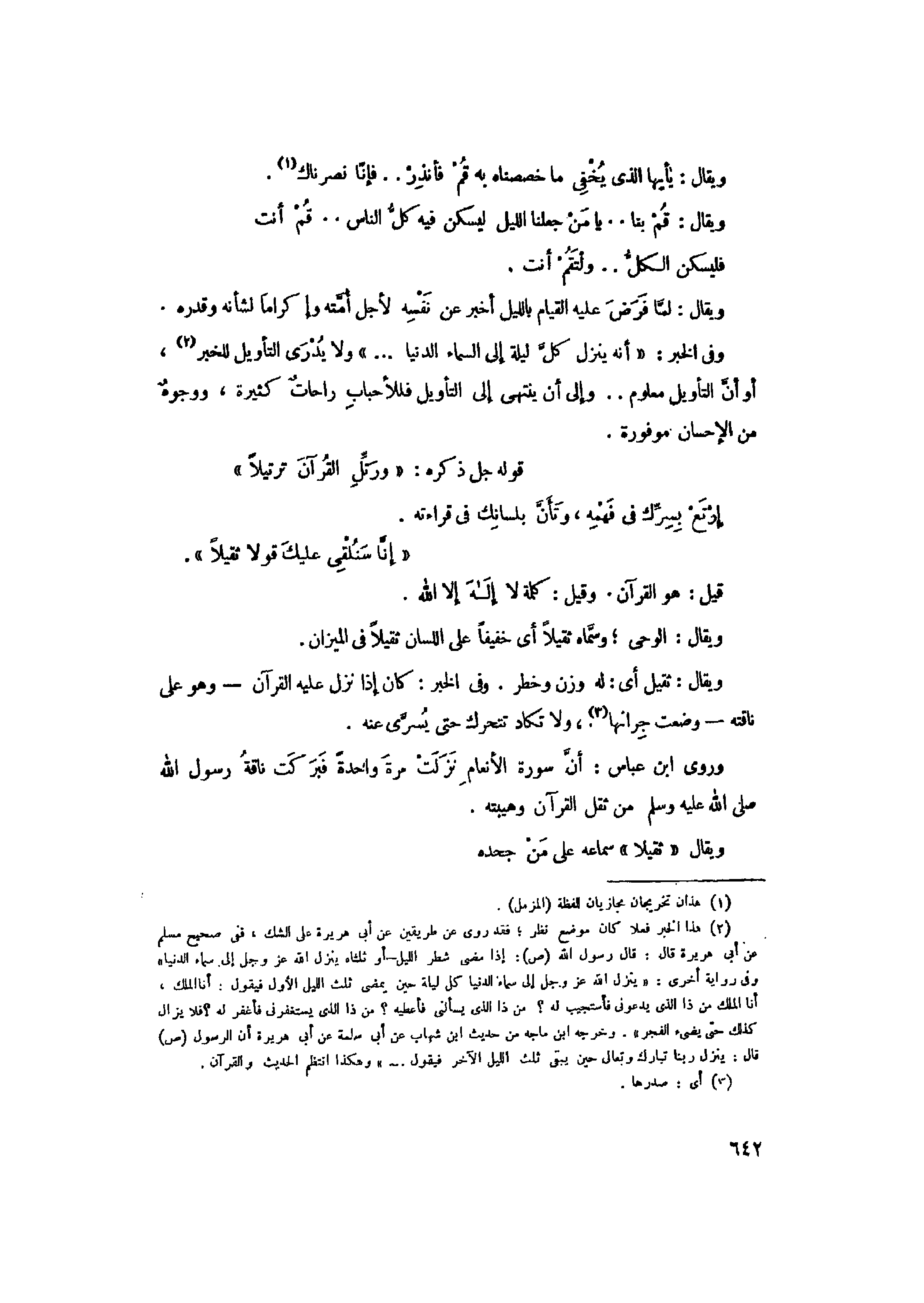 (2) هذا الخبر فعلا كان موضع نظر فقد روى عن طريقين عن أبى هريرة على الشك، ففى صحيح مسلم عن أبى هريرة قال: قال رسول الله (ص) : «إذا مضى شطر الليل- أو ثلثاه ينزل الله عز وجل إلى سماء الدنيا» وفي رواية أخرى: «ينزل الله عز وجل إلى سماء الدنيا كل ليلة حين يمضى ثلث الليل الأول فيقول: أنا الملك، أنا الملك من ذا الذي يدعونى فأستجيب له؟ من ذا الذي يسألنى فأعطيه؟ من ذا الذي يستغفرنى فأغفر له؟ فلا يزال كذلك حتى يضىء الفجر» . وخرجه ابن ماجه من حديث ابن شهاب عن أبى سلمة عن أبى هريرة أن الرسول (ص) قال: «ينزل ربنا تبارك وتعالى حين يبقى ثلث الليل الآخر فيقول ... » وهكذا انتظم الحديث والقرآن. [.....]