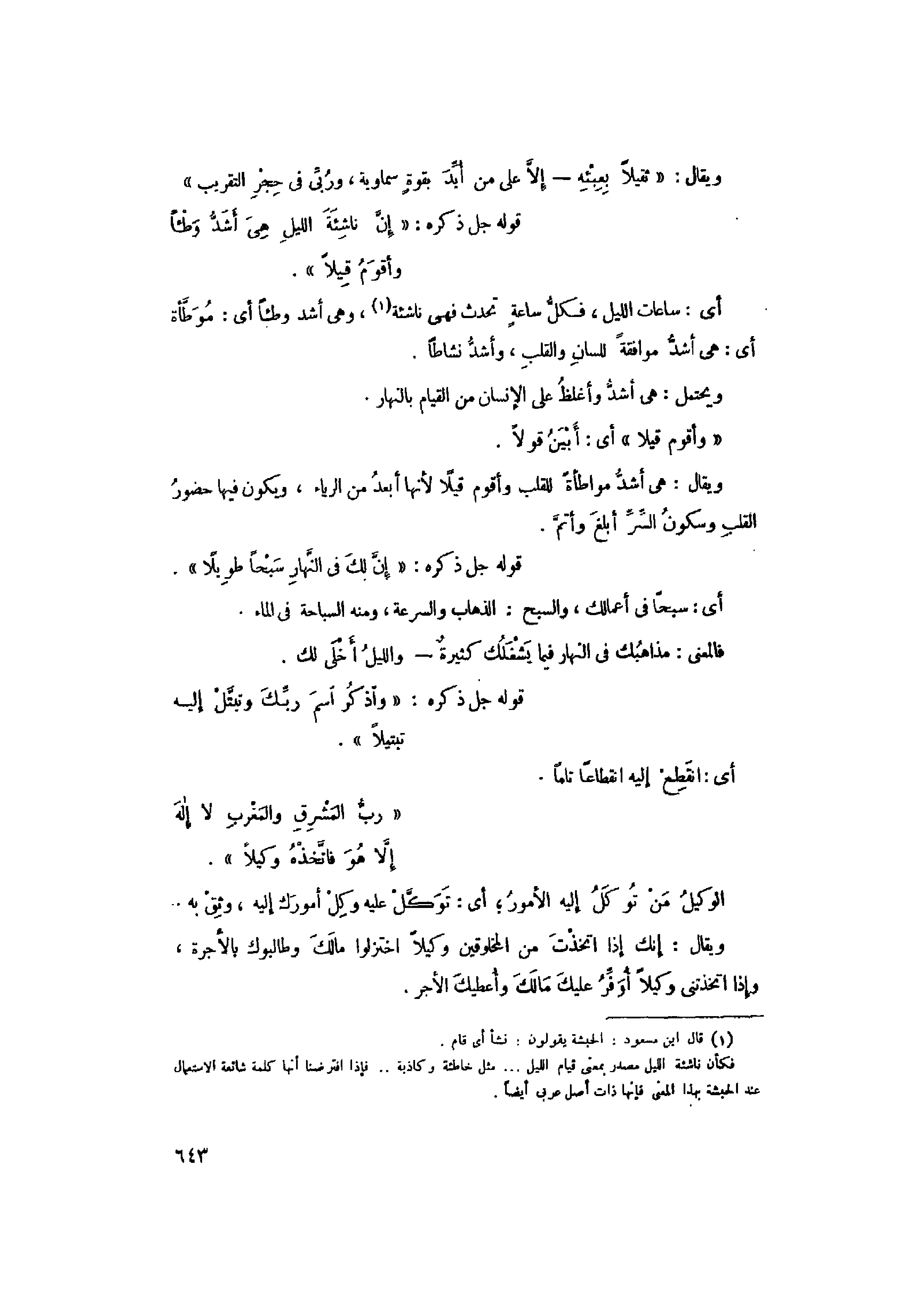 إِنَّ ناشِئَةَ اللَّيْلِ هِيَ أَشَدُّ وَطْئاً وَأَقْوَمُ قِيلاً (6) إِنَّ لَكَ فِي النَّهارِ سَبْحاً طَوِيلاً (7) وَاذْكُرِ اسْمَ رَبِّكَ وَتَبَتَّلْ إِلَيْهِ تَبْتِيلاً (8) رَبُّ الْمَشْرِقِ وَالْمَغْرِبِ لا إِلهَ إِلاَّ هُوَ فَاتَّخِذْهُ وَكِيلاً (9)