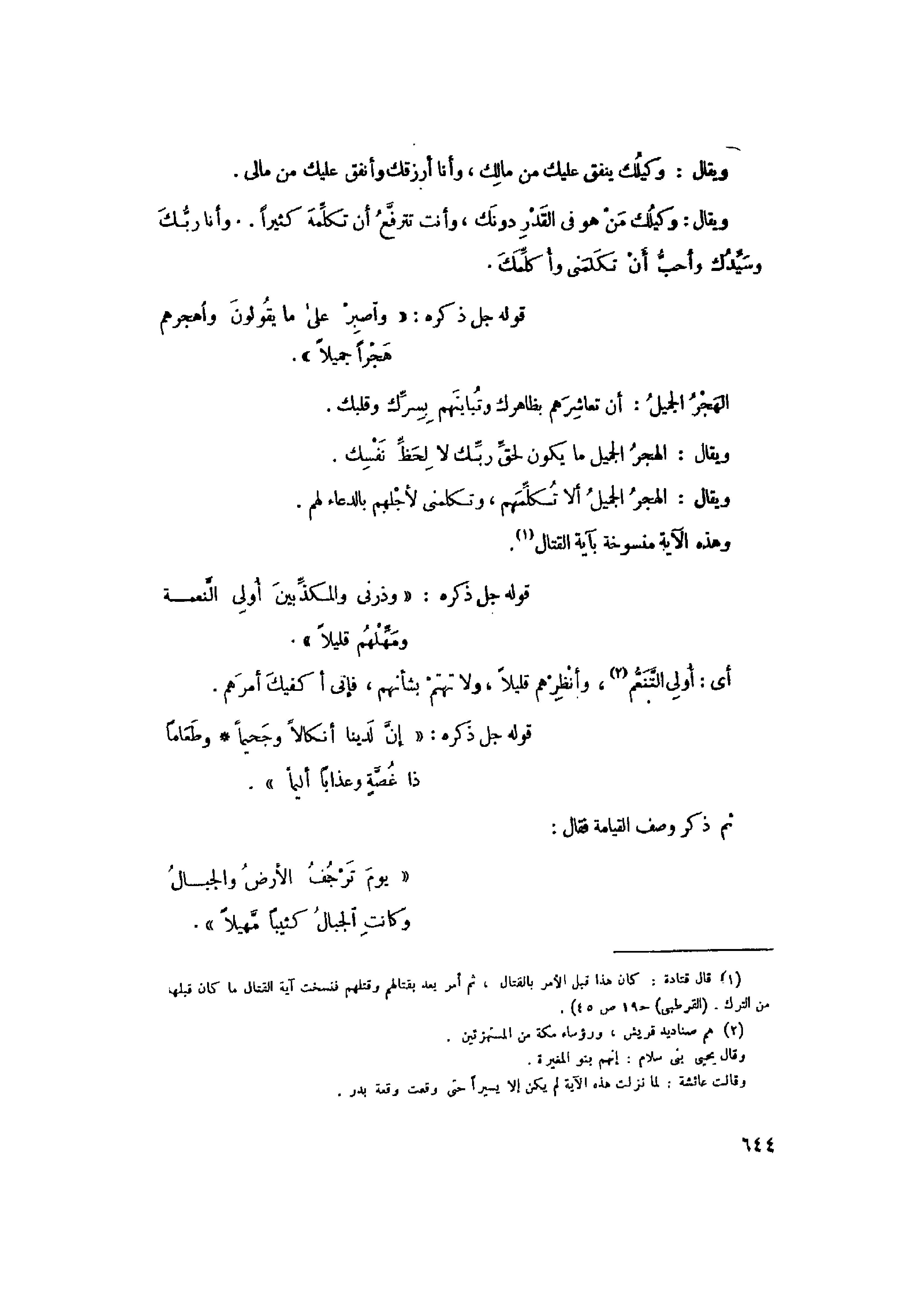 وَاصْبِرْ عَلى ما يَقُولُونَ وَاهْجُرْهُمْ هَجْراً جَمِيلاً (10) وَذَرْنِي وَالْمُكَذِّبِينَ أُولِي النَّعْمَةِ وَمَهِّلْهُمْ قَلِيلاً (11) إِنَّ لَدَيْنا أَنْكالاً وَجَحِيماً (12) وَطَعاماً ذا غُصَّةٍ وَعَذاباً أَلِيماً (13)